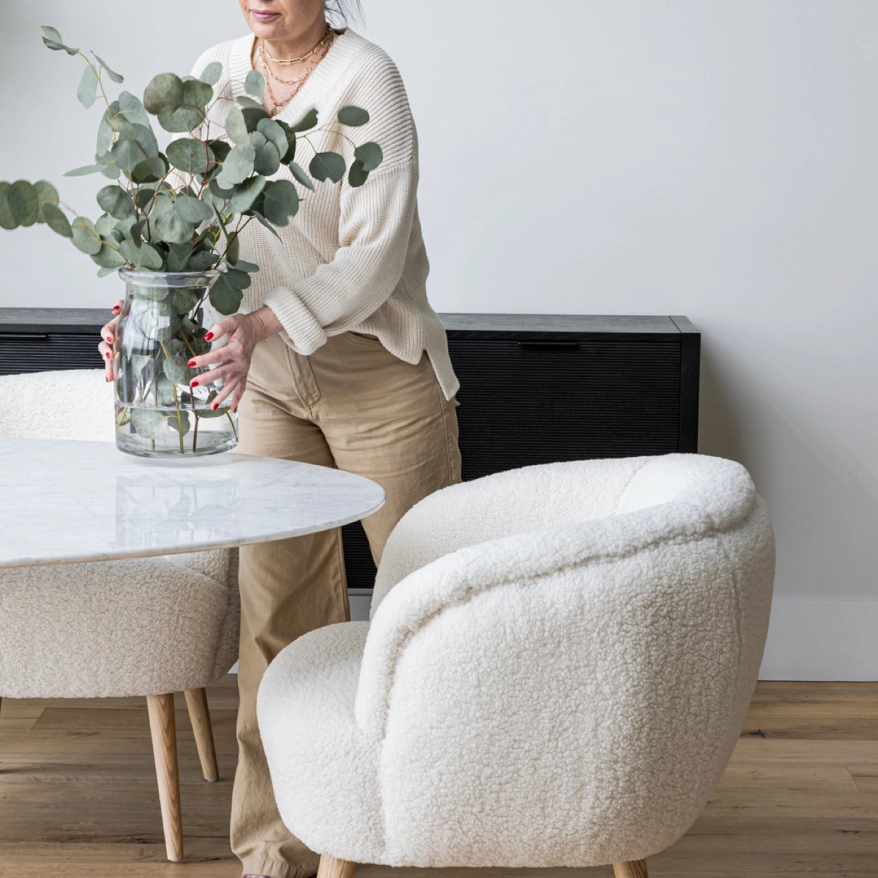 Our Bruges chair is beyond cozy. Made from luxurious teddy fabric, this chair brings the comfort and doesn't compromise on style. Perfect for creating a snug reading corner, as an accent chair in a living room or a warm place to snuggle down in the bedroom, the generous size and classic styling fits in with both classic and more contemporary spaces.