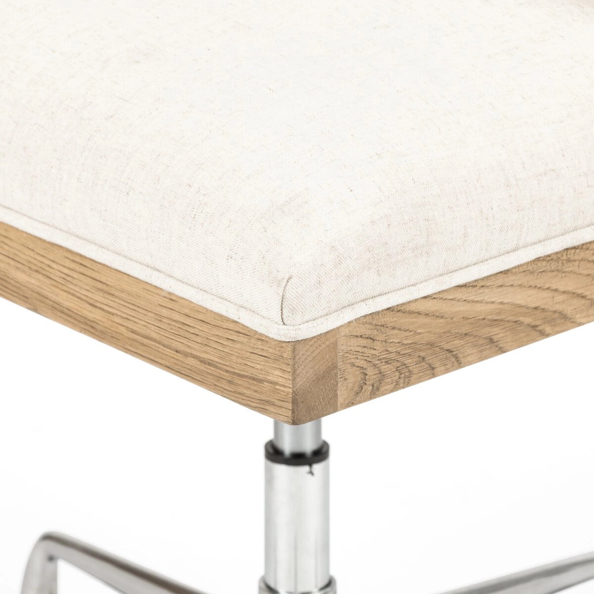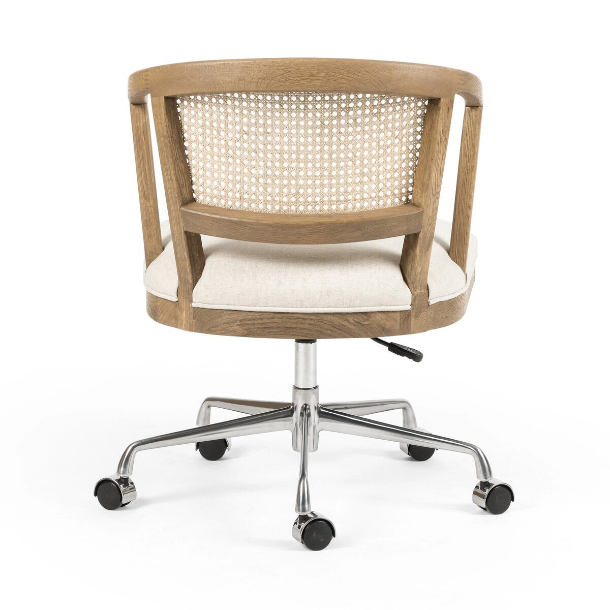 Mixed materials refresh retro office style. Light honey-finished nettlewood frames a textural inlay of natural cane, with linen-blend seating of high-performance fabric set on a swivel base. Performance fabrics are specially created to withstand spills, stains, high traffic and wear, ensuring long-term comfort and unmatched durability.