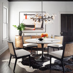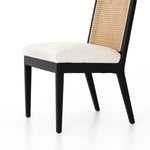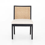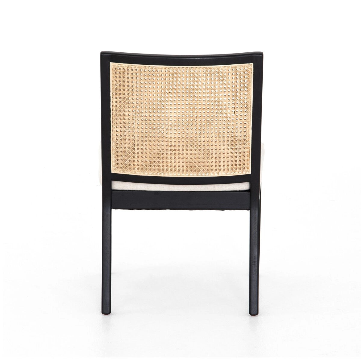 Mixed materials refresh a retro armless style. Brushed ebony nettlewood frames a textural inlay of dark finished cane and linen-blend seating of high-performance fabric. Performance fabrics are specially created to withstand spills, stains, high traffic and wear, ensuring long-term comfort and unmatched durability.