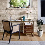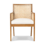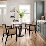 Mixed materials refresh retro dining style. Brushed ebony nettlewood frames a textural inlay of natural cane, for perfect contrast. Neutral linen-blend seating of high-performance fabric for modern sensibility.