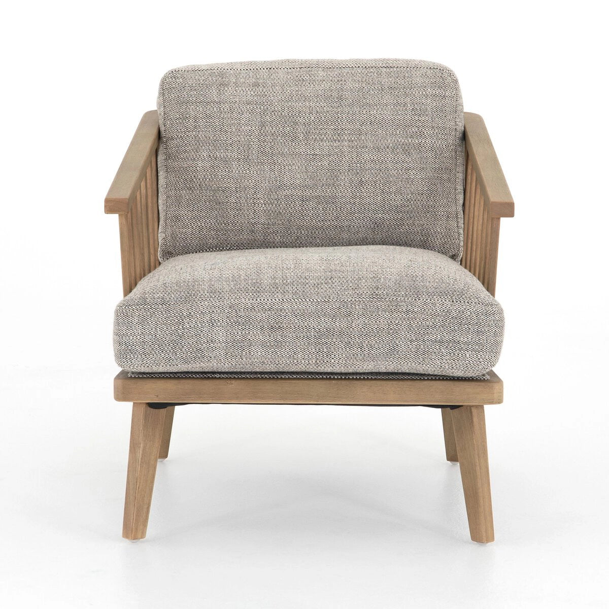 Spindle detailing for an airy look, with angular wooden arms and cleverly positioned legs, plus feather-blend cushioning covered in a textural performance-grade upholstery exclusive to Four Hands.