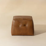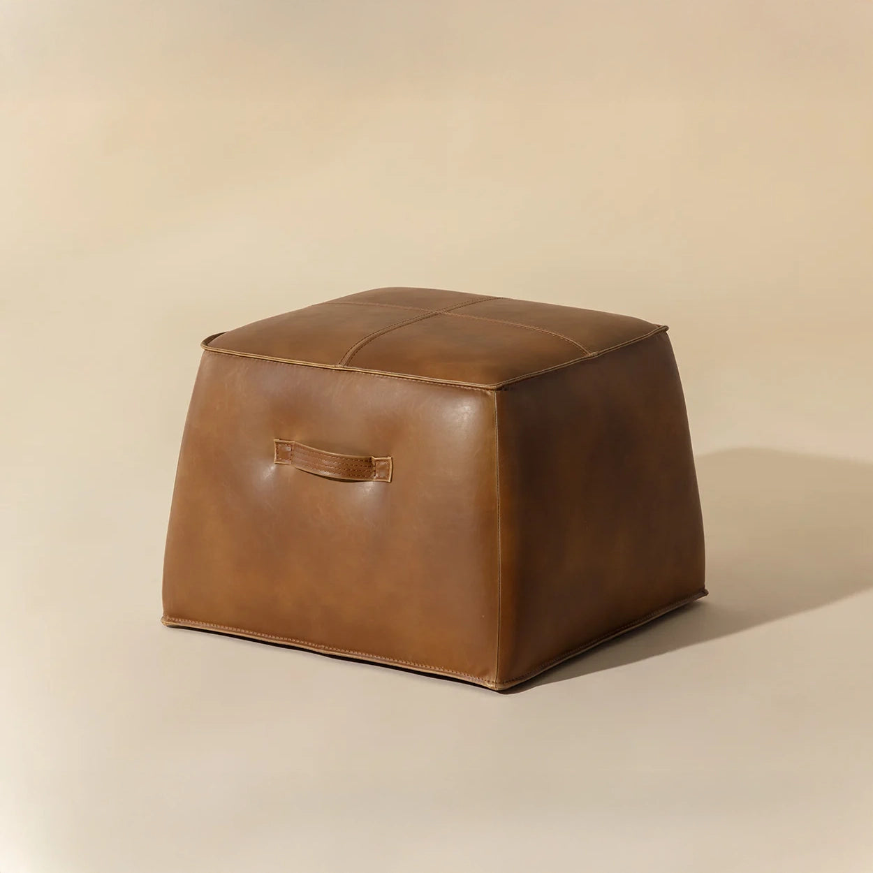A handsome cubed ottoman stocked in a vintage-look havana dark brown, tobacco tan faux leather and overcast grey faux leather. Features a decorative handle and exposed stitching for added dimension. Suitable for residential and commercial environments. Handle With Care: This design has been crafted with faux leather. Faux leather is manufactured to reflect the natural characteristics of leather; as such, colour variations, markings wrinkles, grooves, and light scratches are appreciated characteristics. No two pieces will be alike.