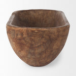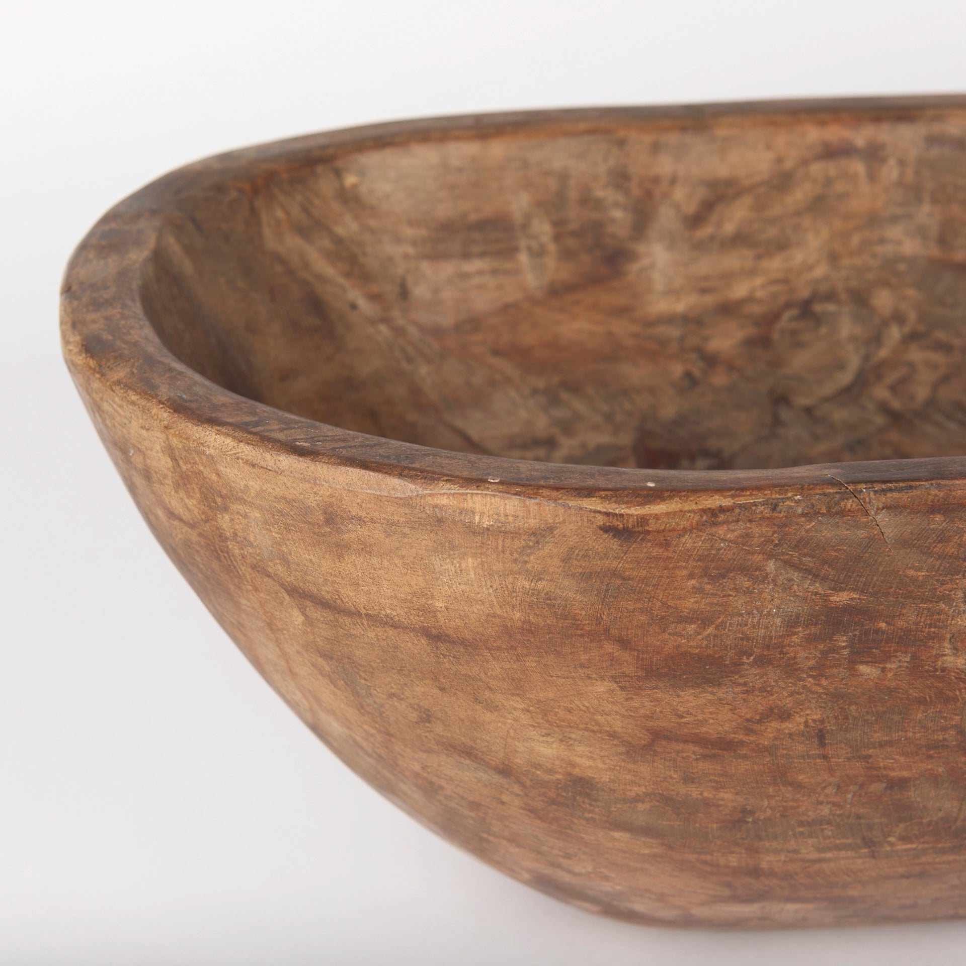 An extra large hand-carved oval bowl made of reclaimed wood and finished in a medium brown.