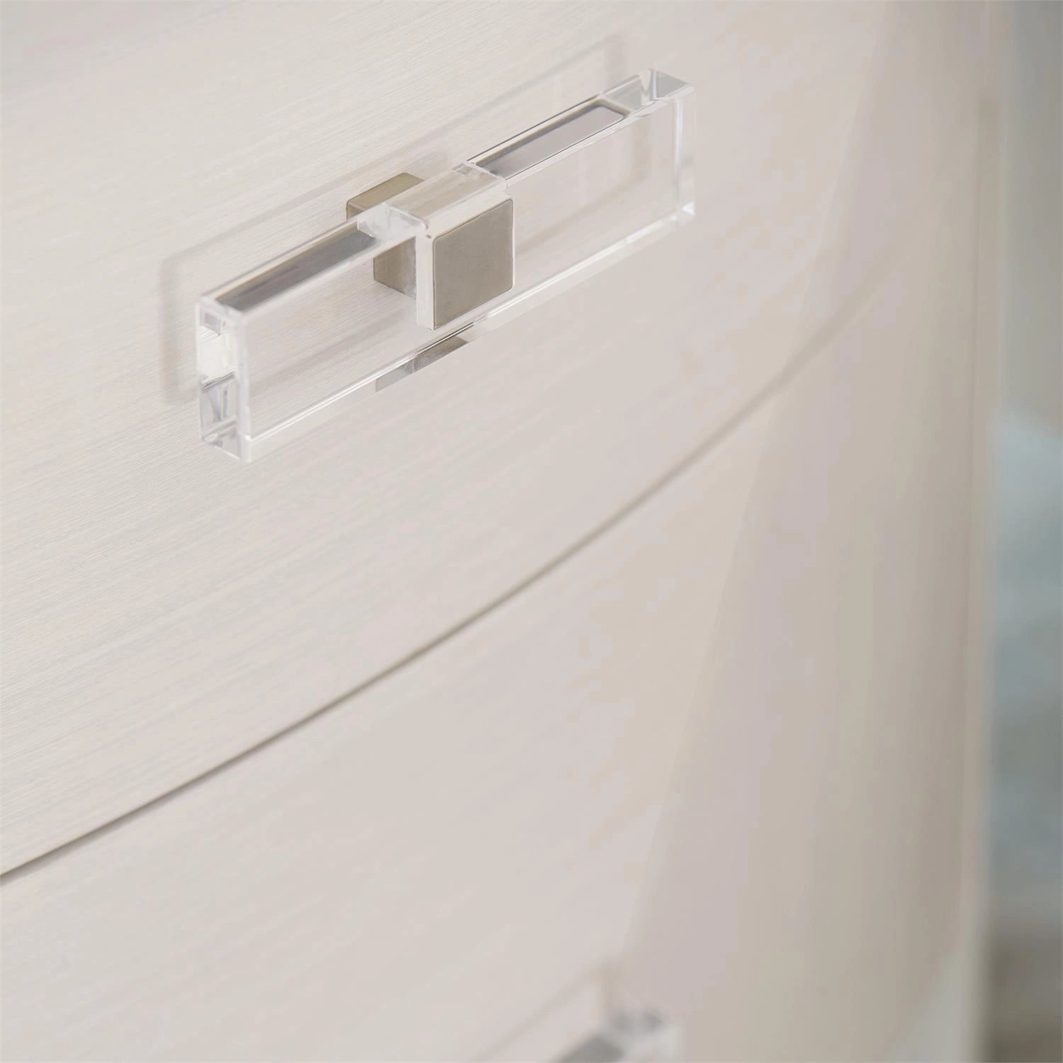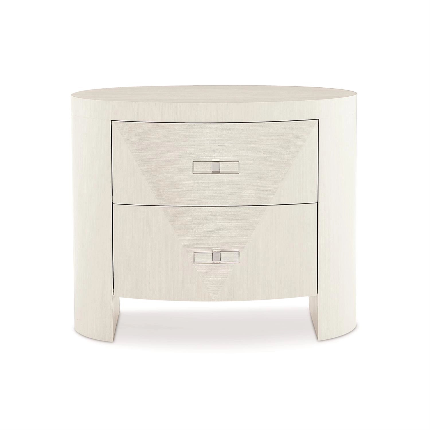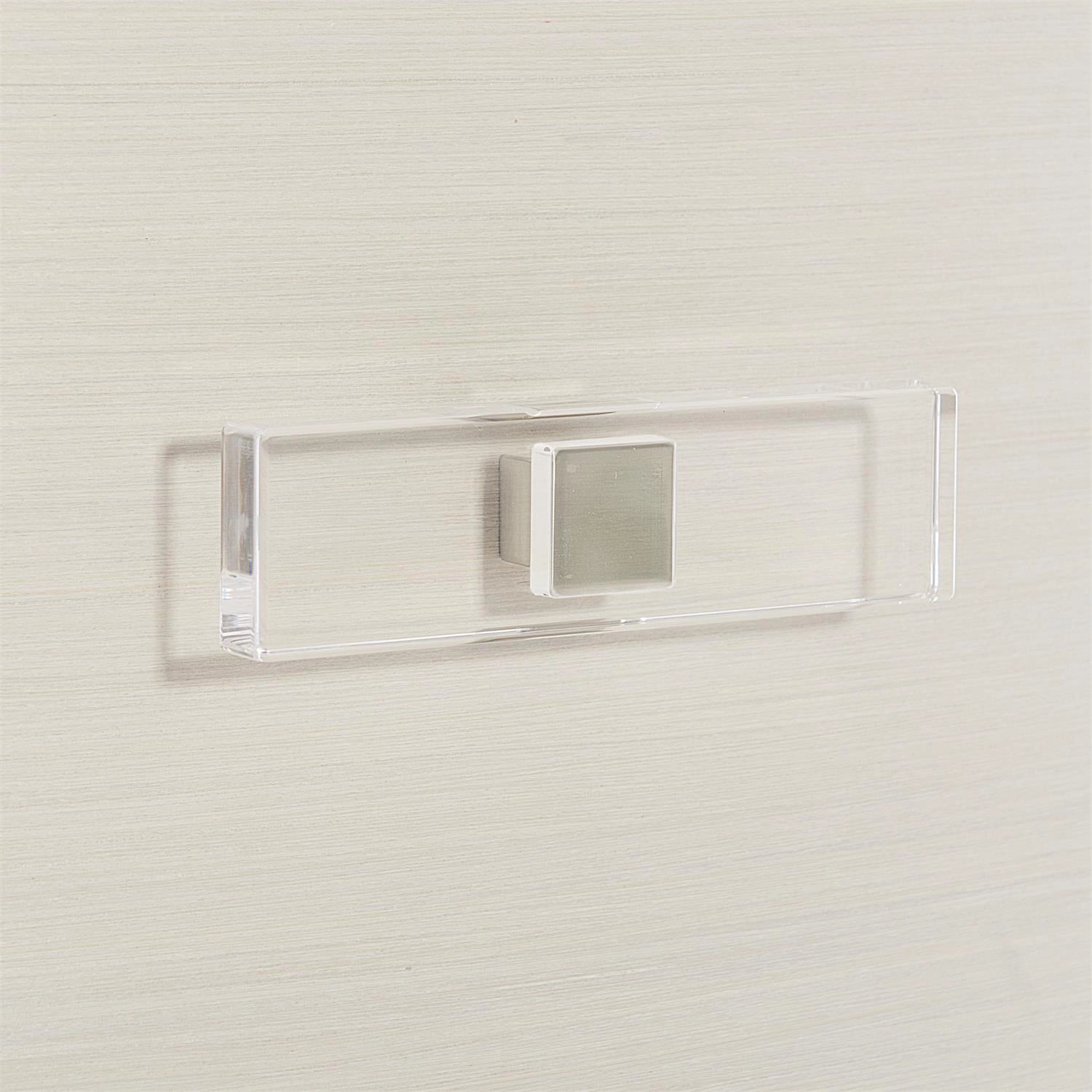 This nightstand offers a unique material story, blending veneers with acrylic and metal accents in a clean, sleek design.