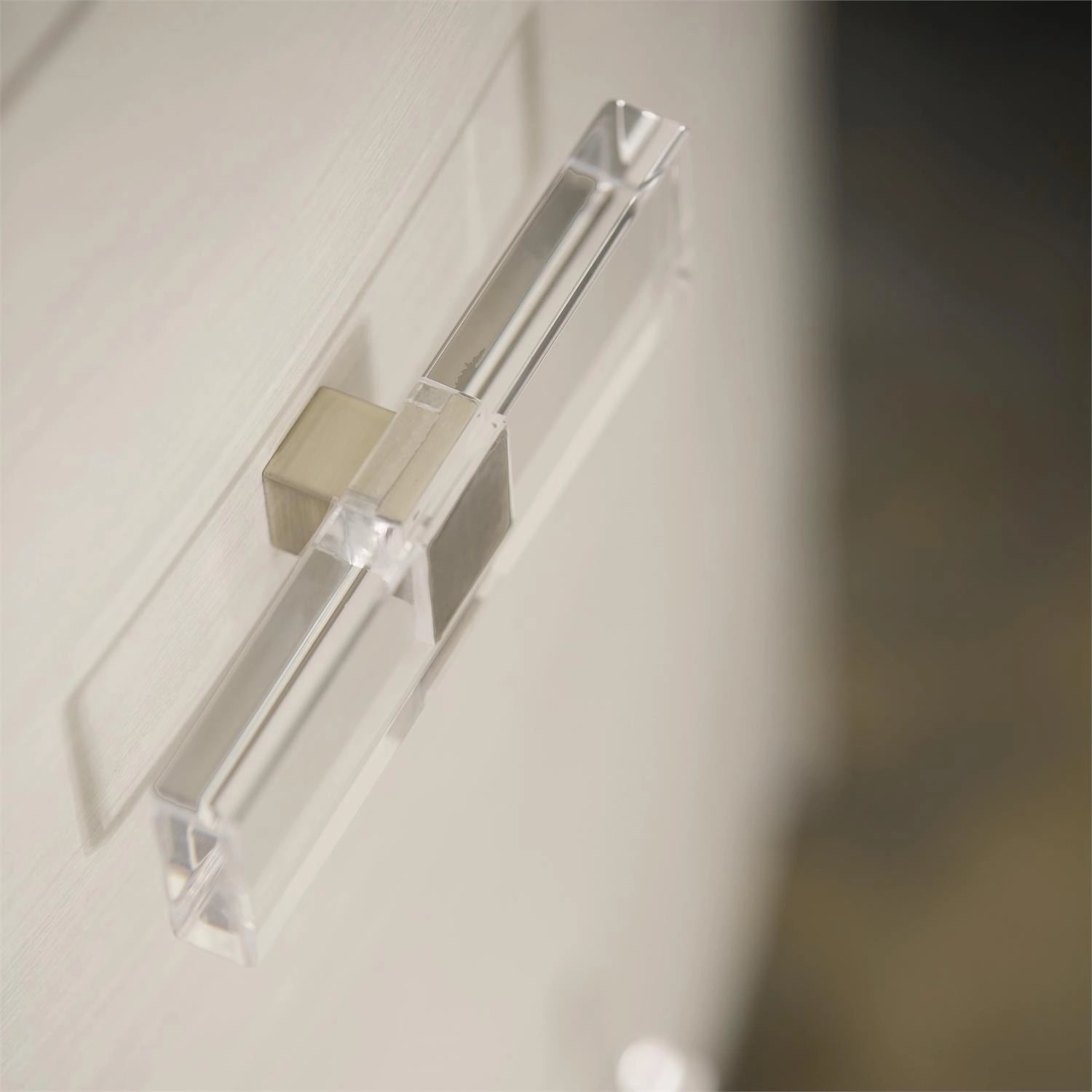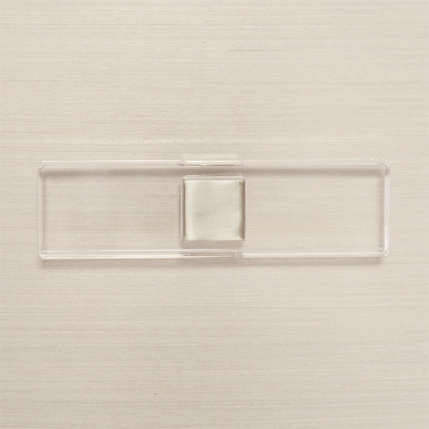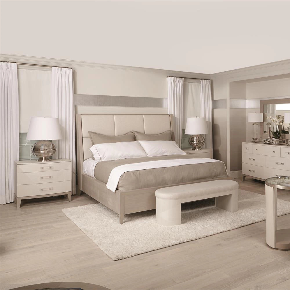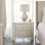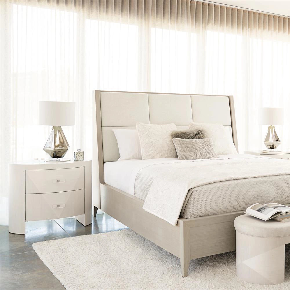 This nightstand offers a unique material story, blending veneers with acrylic and metal accents in a clean, sleek design.