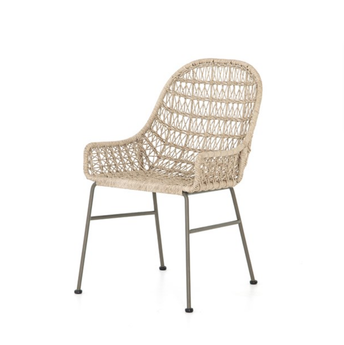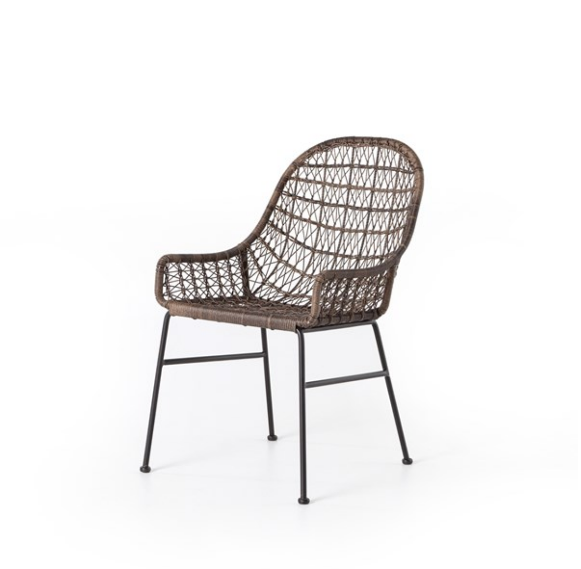 Clean, contemporary shaping and an updated weave transform all-weather wicker into something modern. This low-armed dining chair is supported by a contrasting black iron base. Safe for outdoor spaces — cover or store indoors during inclement weather and when not in use.