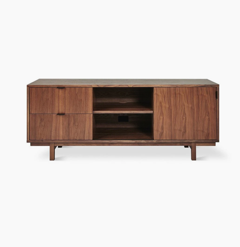 The Belmont Media Stand is an architecturally inspired storage design that features the natural beauty of walnut. Designed for Hi-Fi and media components, a back panel opening in the cabinet allows for concealed cable management. Drawers provide storage to keep your living room uncluttered, while adjustable shelves and a sliding front panel let you reveal or conceal components. Part of the Belmont Storage Series, this media stand matches perfectly with the Belmont Credenza and End Table.