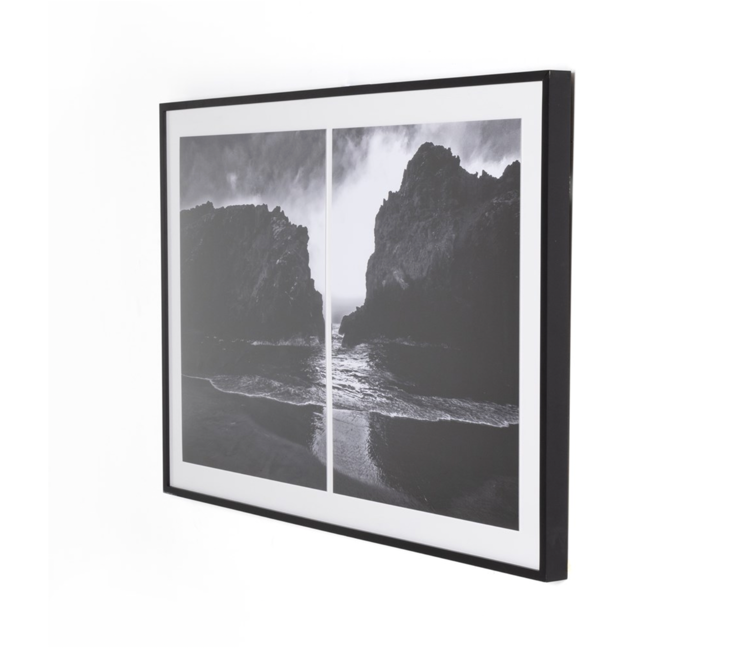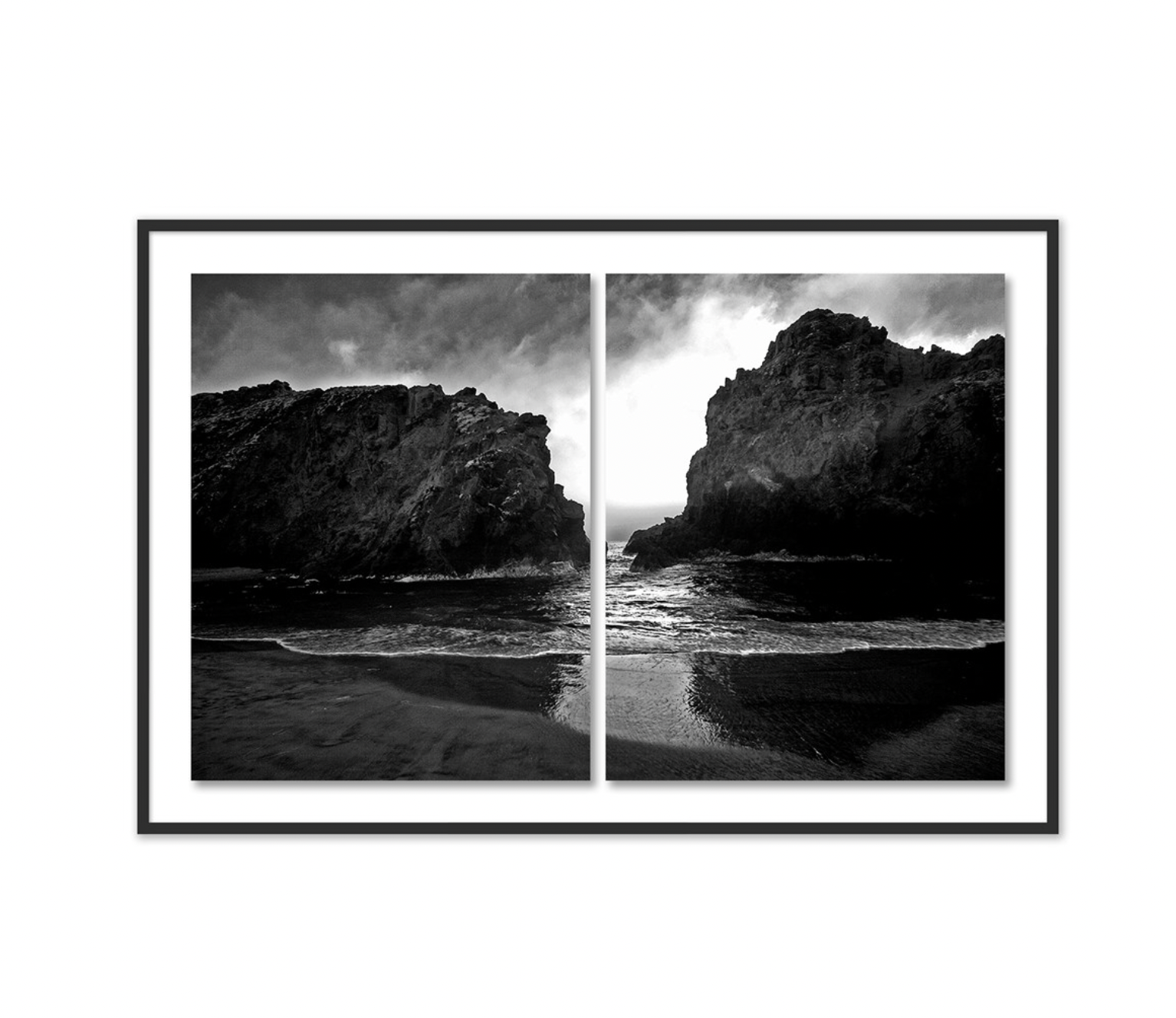 A trip down the coast. Black-and-white diptych, printed on photo paper with double-thick white matte and acrylic glazing. Framed in black maple for a gallery-quality look. Handmade in Austin, Texas.