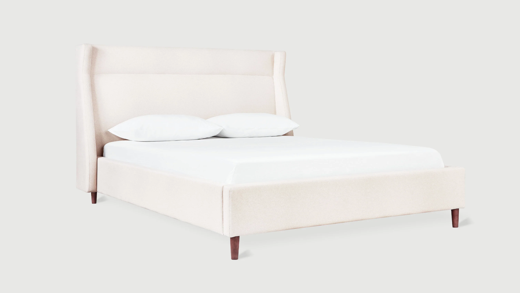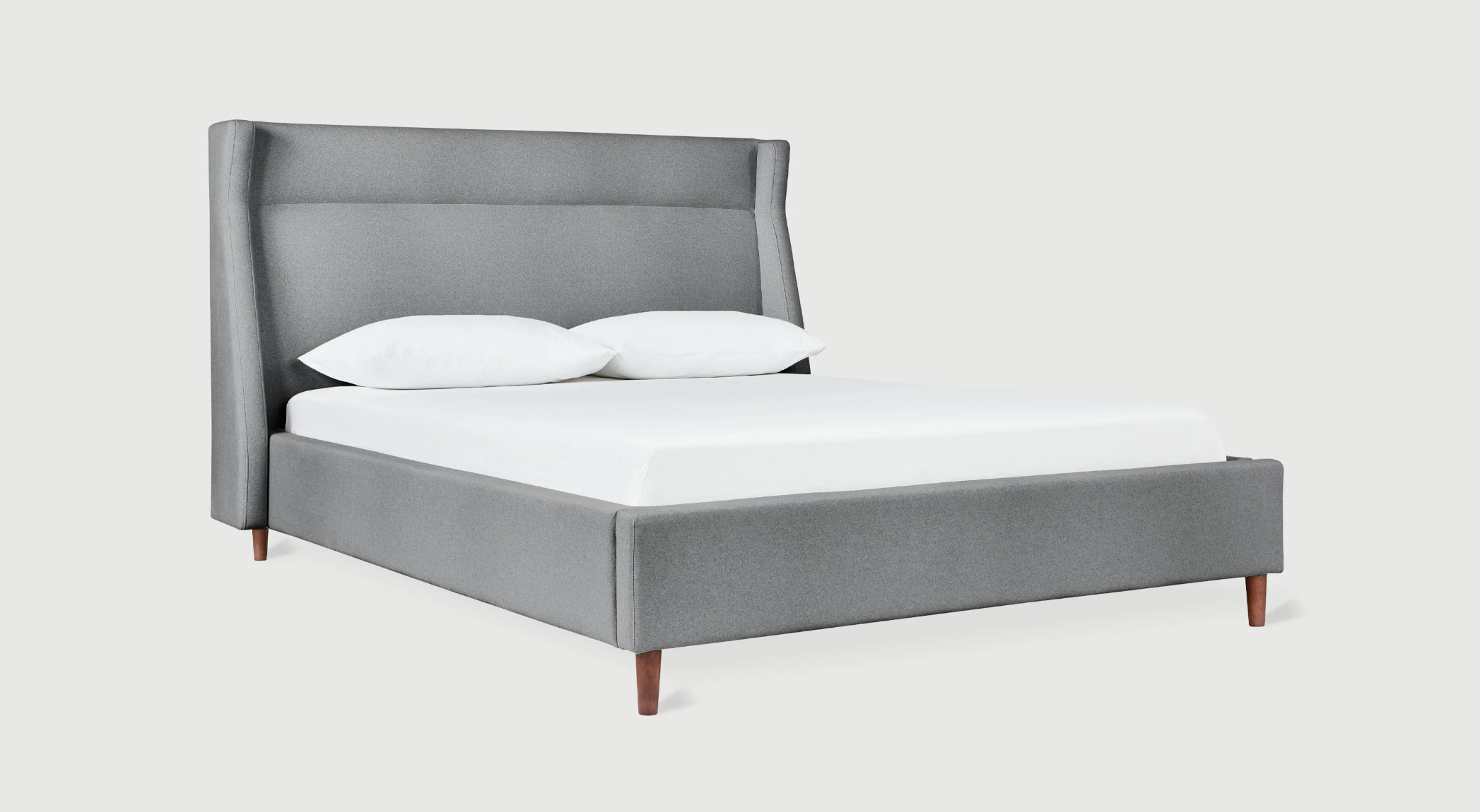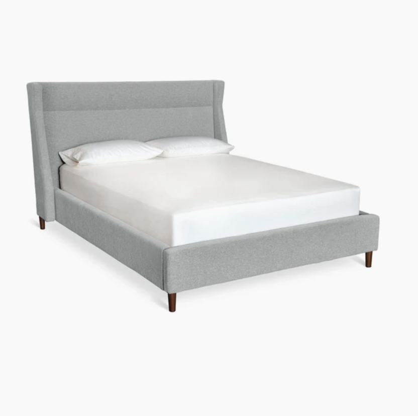 The Carmichael Bed fuses traditional and contemporary sensibilities, bringing clean, modern lines to a classic style. The design features a fully upholstered headboard, footboard and side rails, with elegant, tapered solid wood legs. The bed includes a sturdy mattress suspension system which eliminates the need for a box spring. All wood used in the frame and legs is FSC®-Certified, in support of responsible forest management.