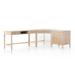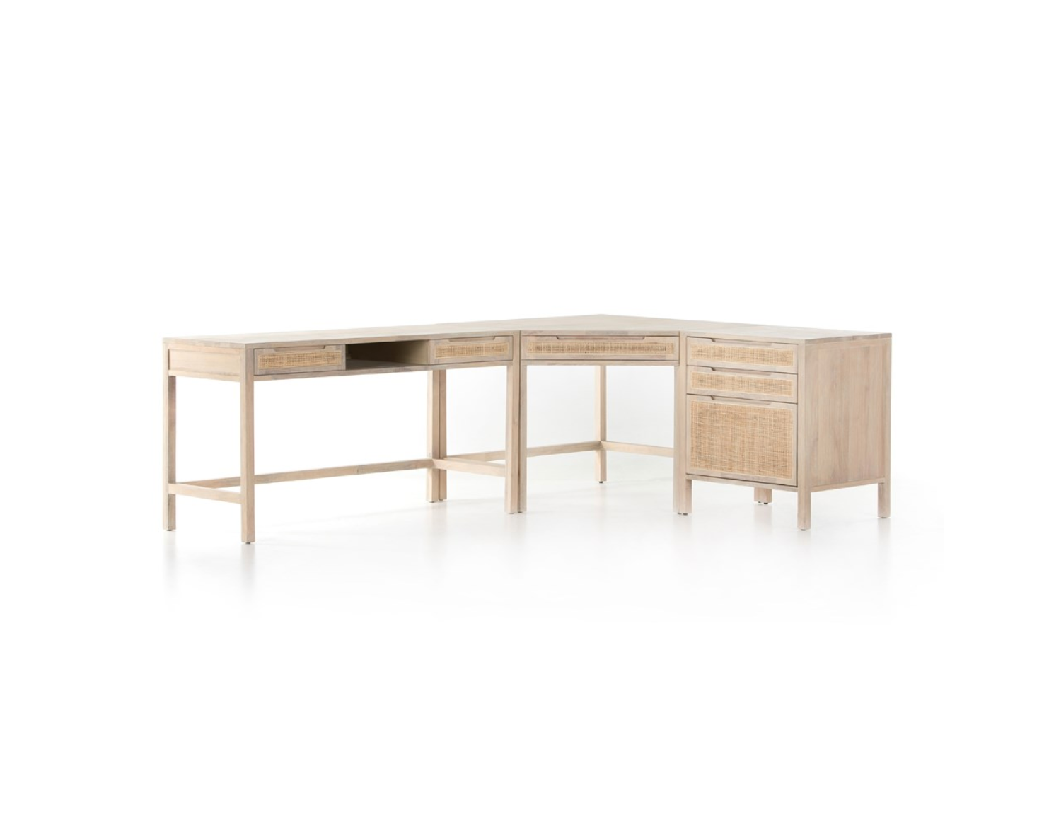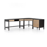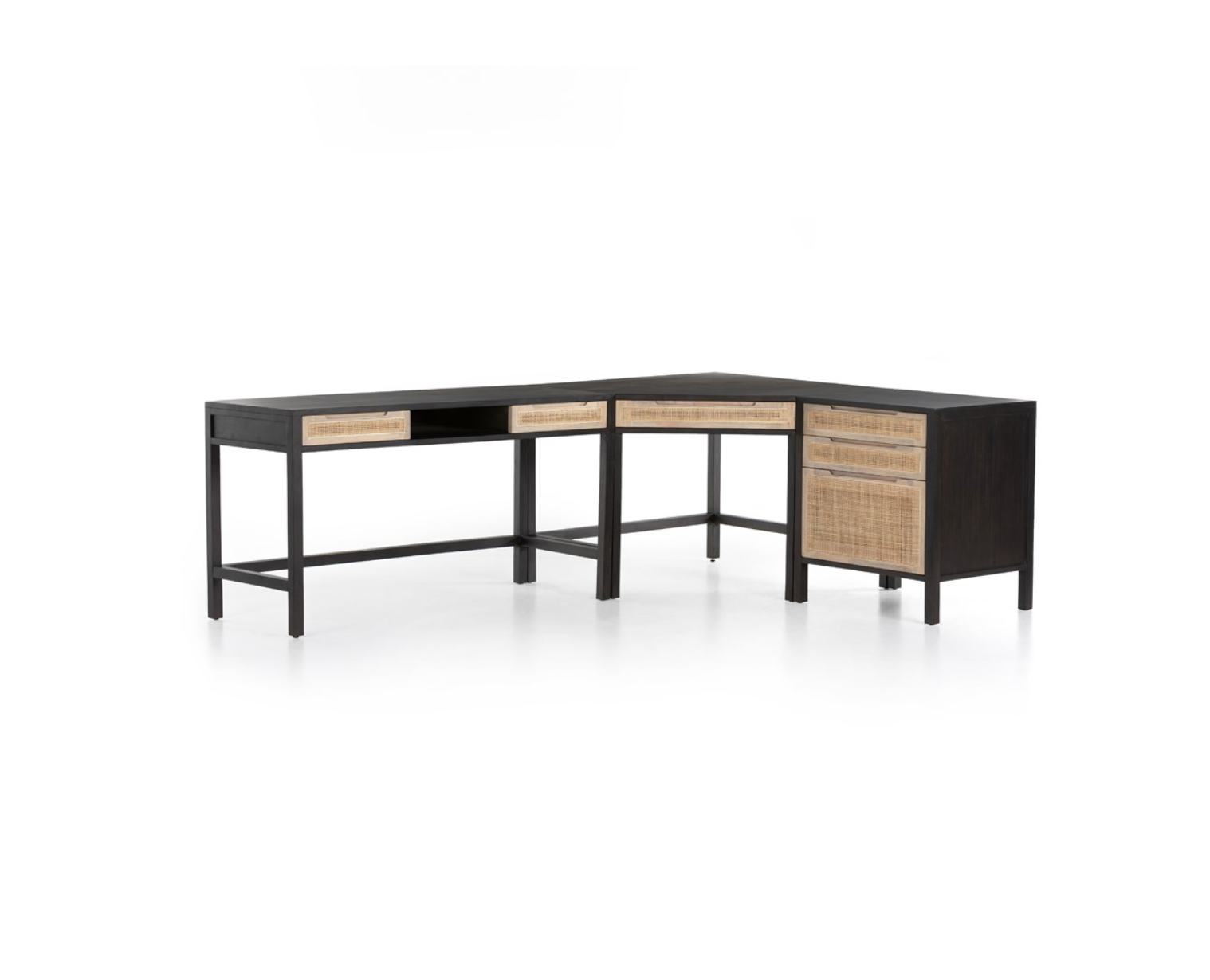 Mid century-spirited while beautifully on trend. With a slim, angular silhouette, a modular desk and matching filing cabinet of black-washed mango features natural cane-covered drawer fronts plus a center open cubby, bringing storage contrast and texture to the modern office.