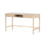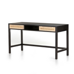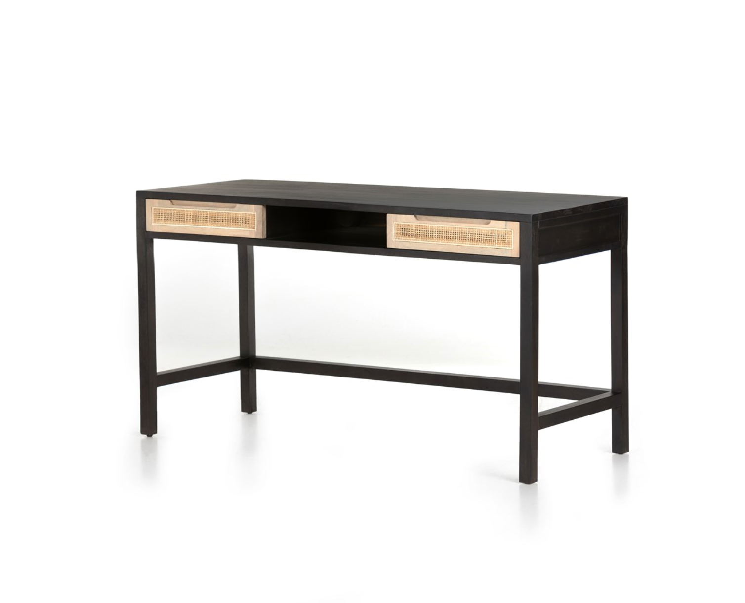Mid century-spirited while beautifully on trend. With a slim, angular silhouette, a modular desk of black-washed mango features natural cane-covered drawer fronts plus a center open cubby, bringing storage, contrast and texture to the modern office. Great solo or paired with matching corner desk, file cabinet or credenza.