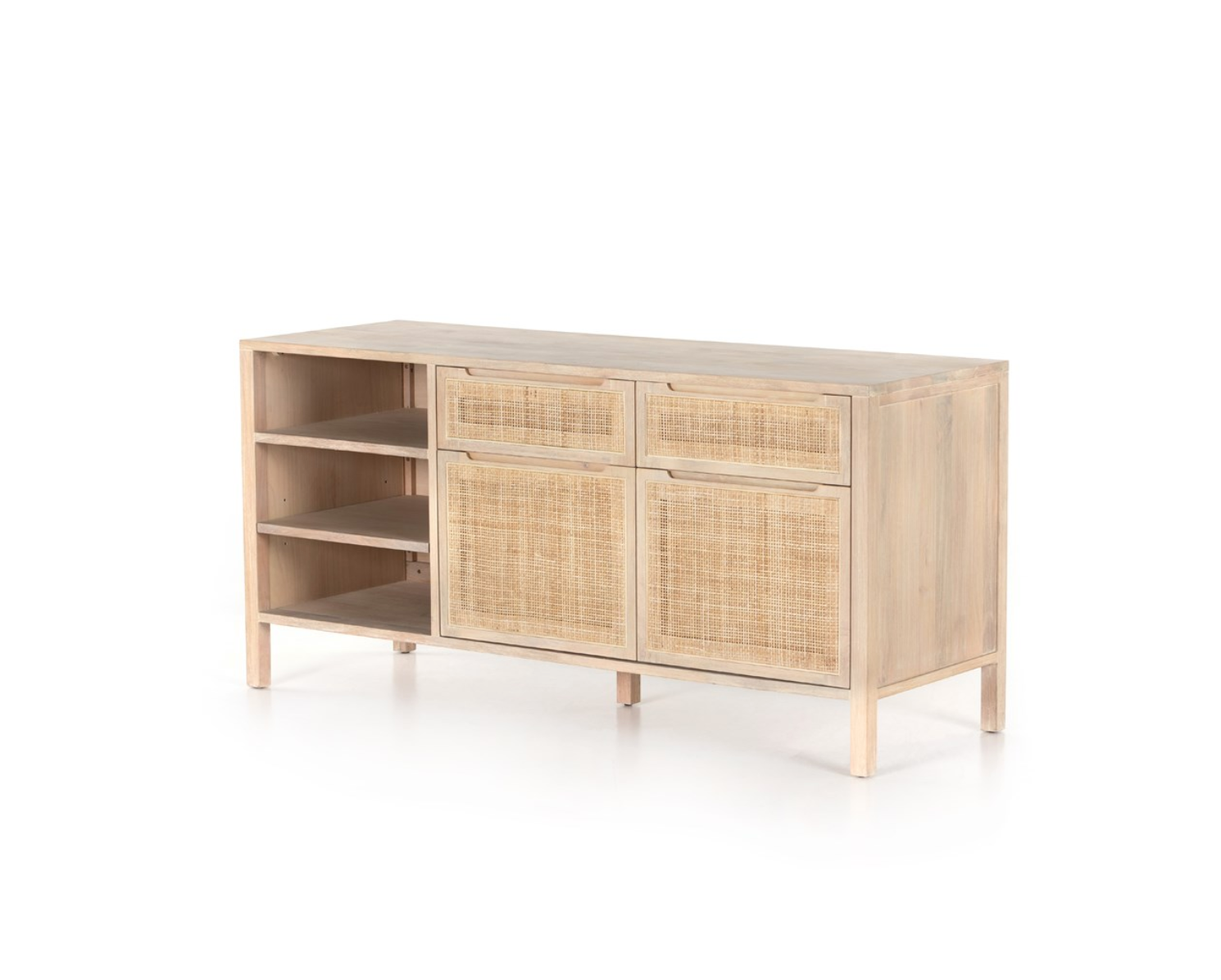 Mid century-spirited while beautifully on trend. A clean-lined filing credenza of black-washed mango features natural cane-covered drawer fronts plus open shelving, bringing storage, contrast and texture to the modern office. Style solo or pair with matching desk and/or filing credenza.