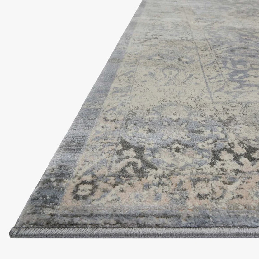 Smoky blues, greys and creams give texture to this rug. Power loomed of polypropylene and polyester for strong durability.