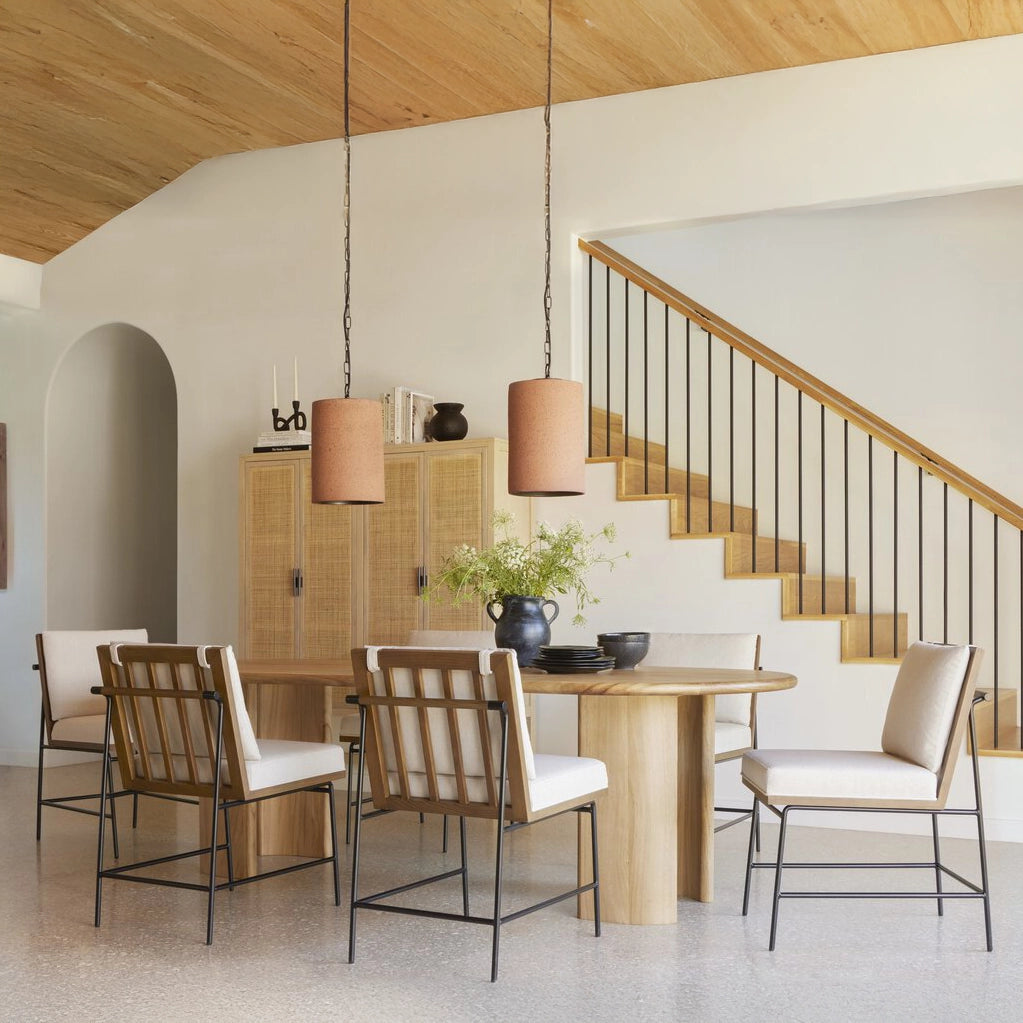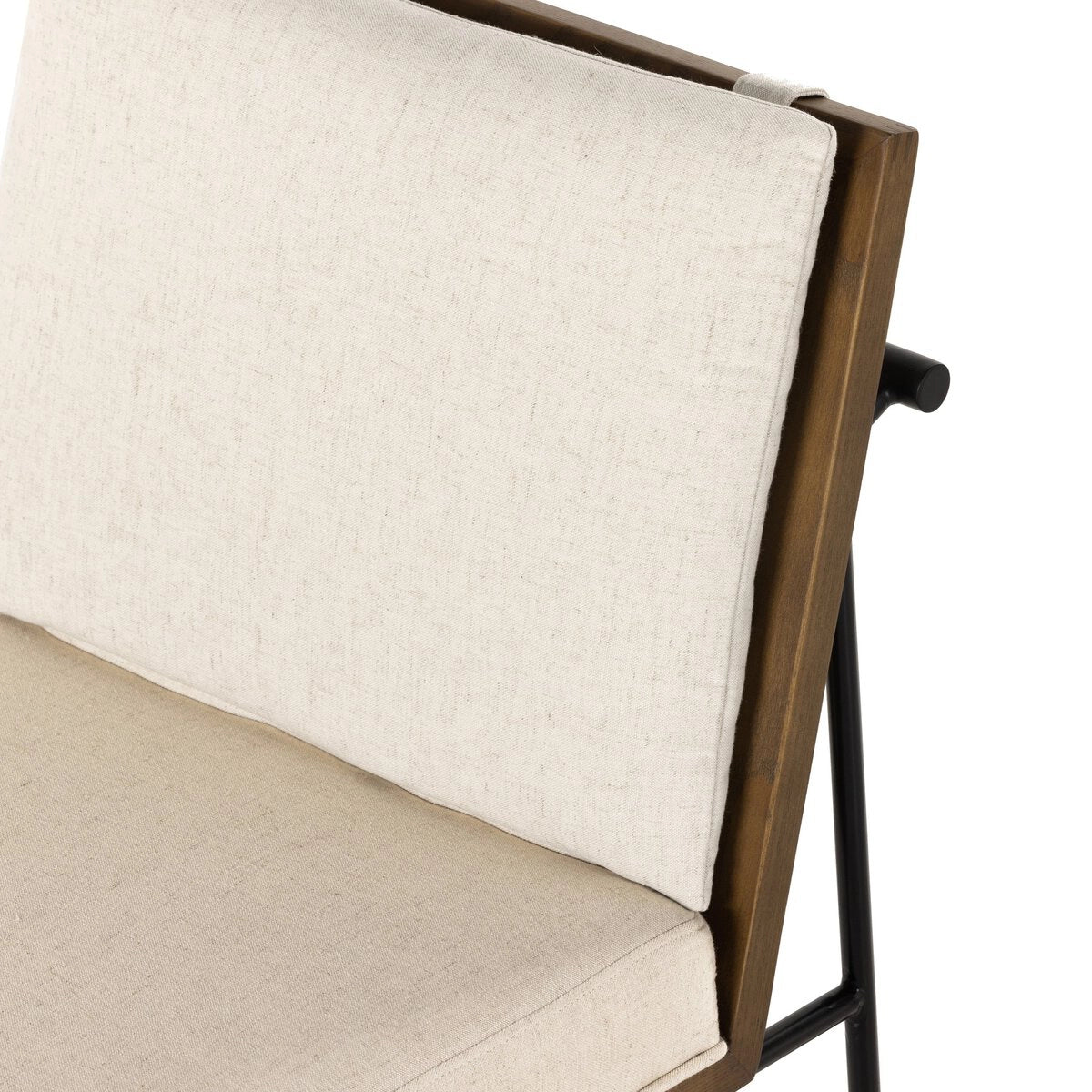 Crisp and clean, with natural panache. Slim, black-finished iron frames a floating ladderback of honey-finished oak and cream-colored linen-blend seating. Rear handle detail adds a fashionable finishing touch.