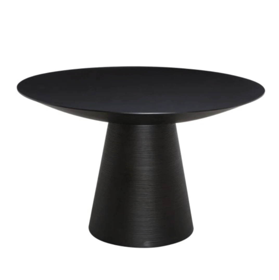 The Dania large dining table, a bold statement piece inspired by contemporary Japanese design. A distinctive ribbed base plinth projects an intriguing profile, the uniquely crafted rounded tabletop highlights the Danias sculptural appeal.