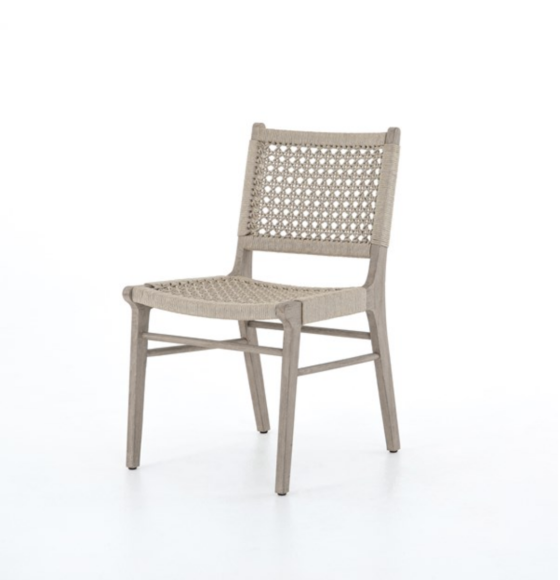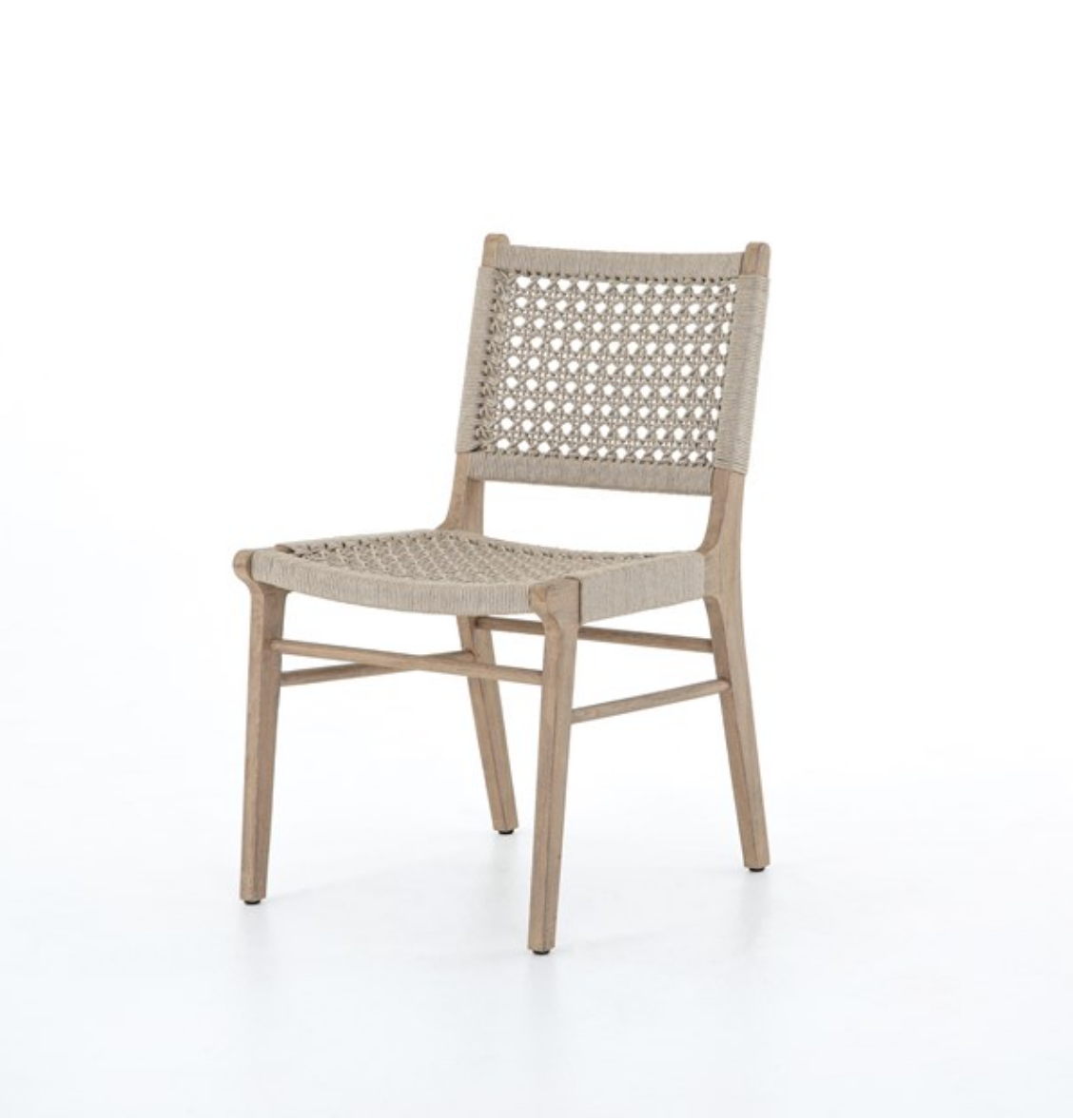 Simply stylish, indoors or out. Washed brown teak frames woven ivory rope, making a texture-driven statement. Cover or store inside during inclement weather and when not in use.