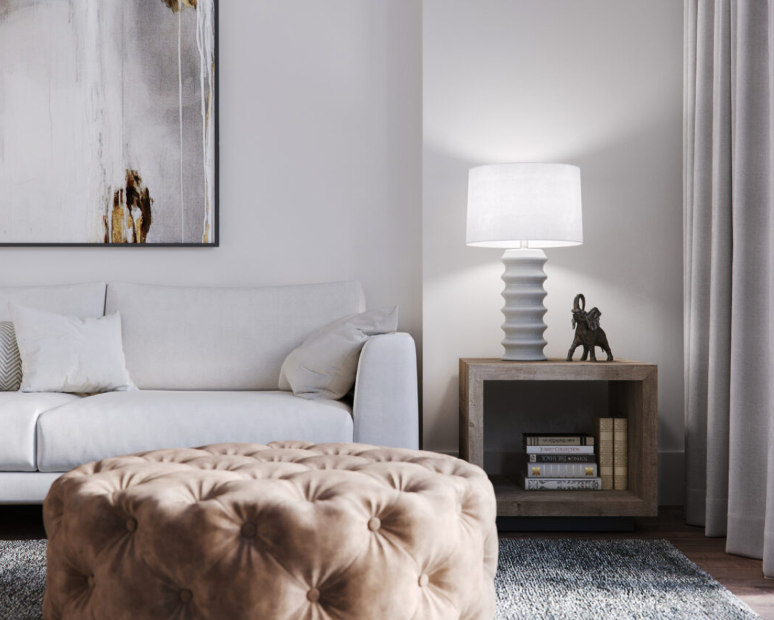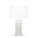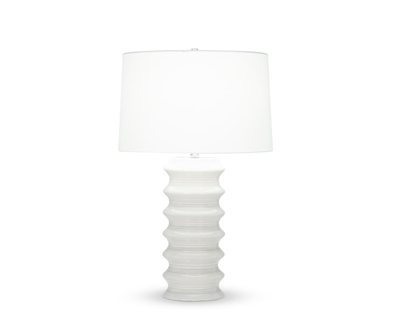 A softly sculptural ceramic table lamp wears a Light Grey finish for a versatile modern statement. An Off-White cotton tapered drum shade tops the look. Place this modern lamp in a living room for a neutral accent.