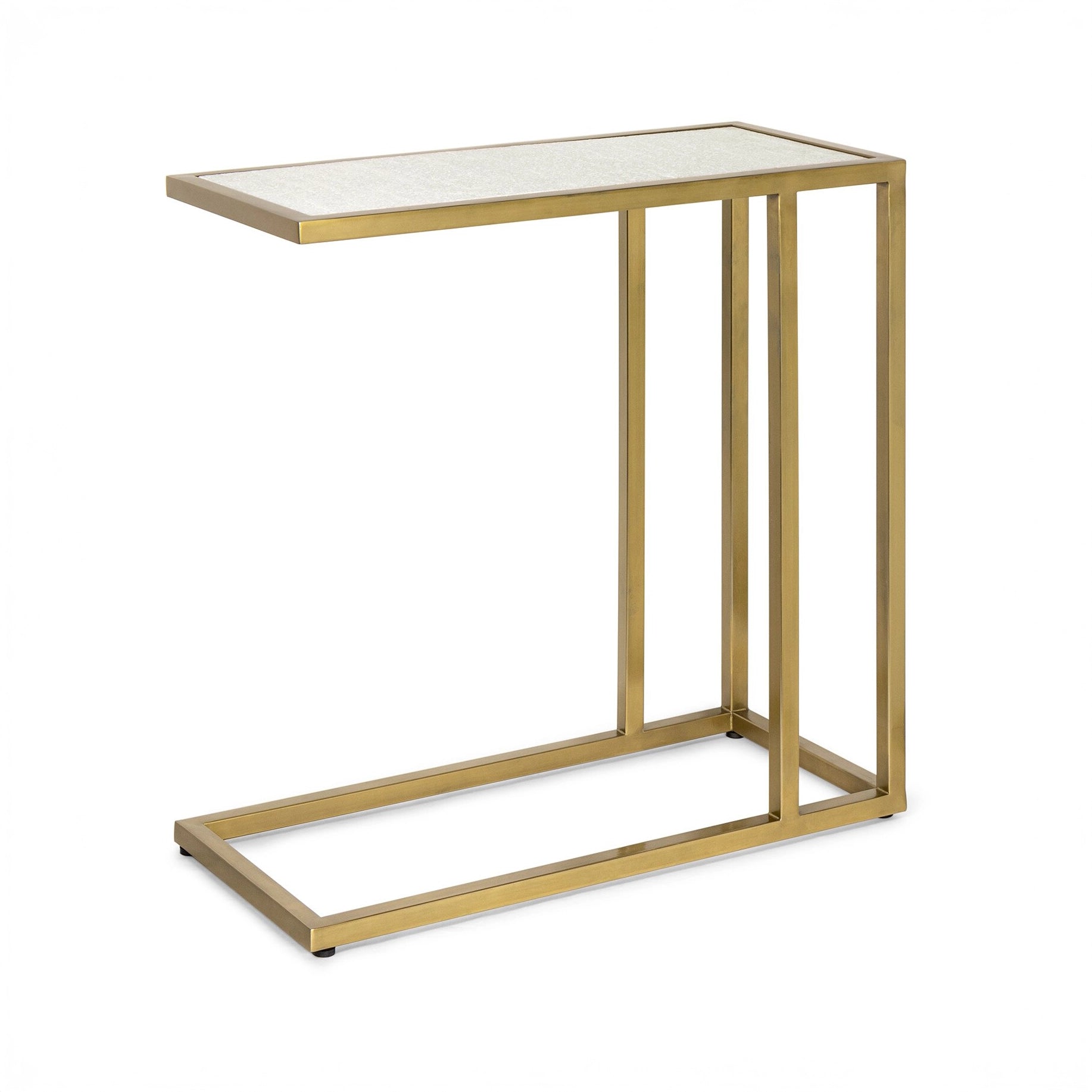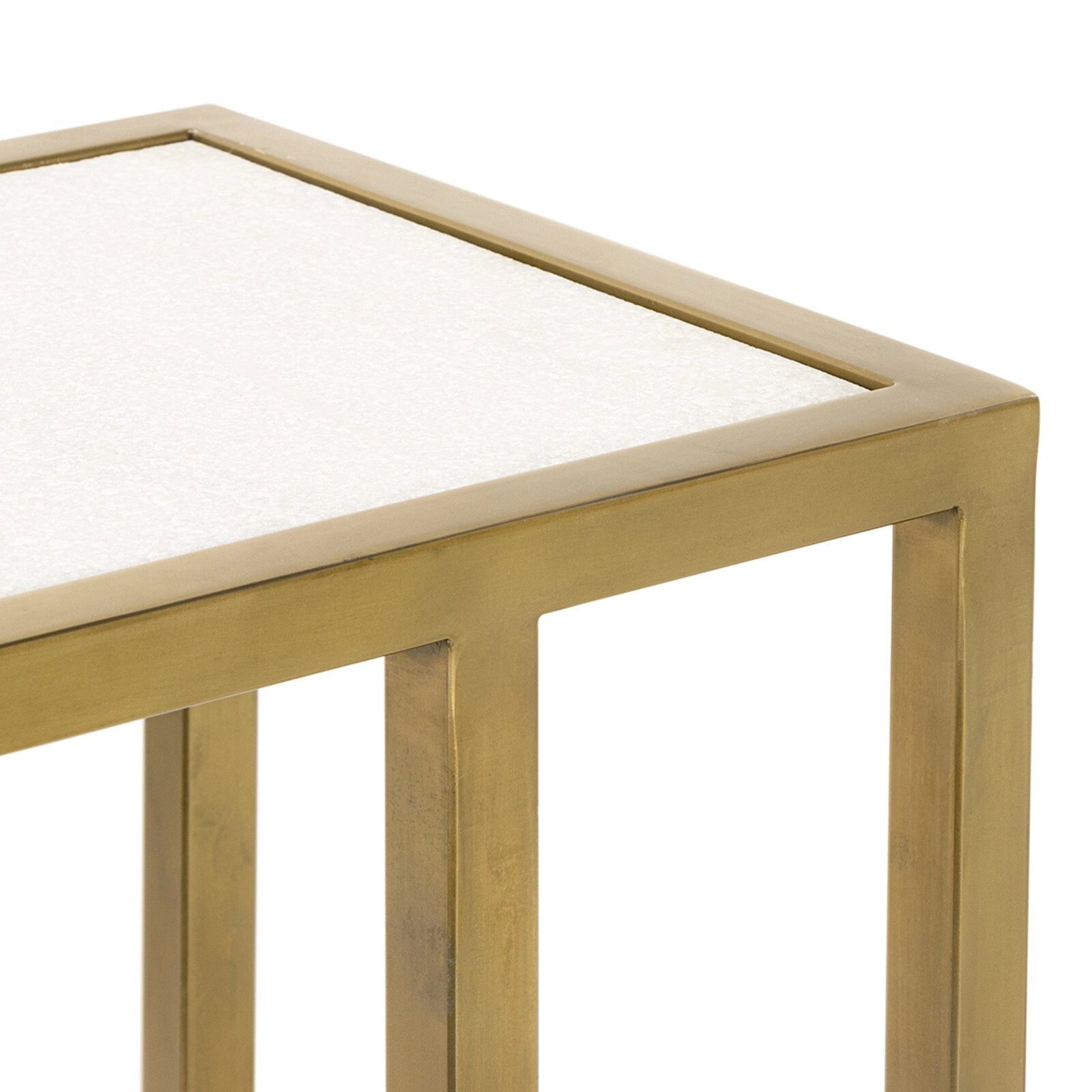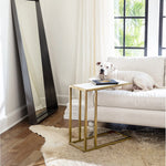 At home in a variety of decors, the Echelon sofa hugger table pairs a white marble slab with a natural brass iron frame. Sized to sit within perfect reach, the table is designed to hold your favorite cocktail beside an armchair, a sofa, or a settee.