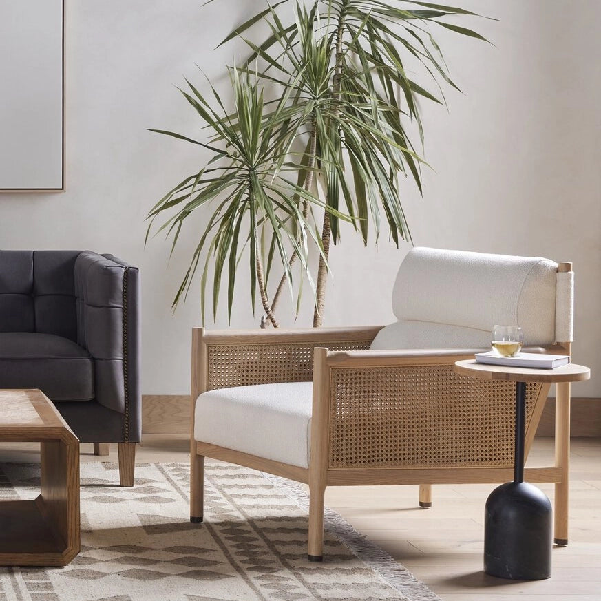Layer in a sculptural element anywhere. A dramatically shaped base of black marble supports slim iron piping and rounded tray-style tabletop - the perfect place to perch a drink or favourite book.