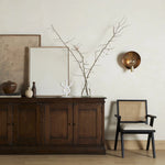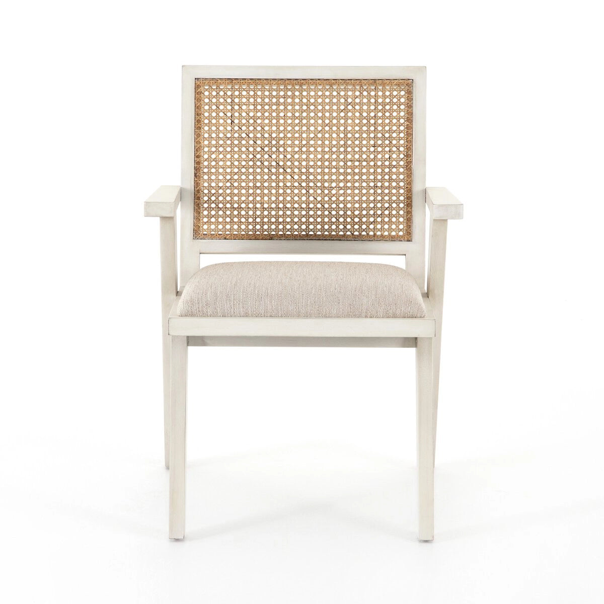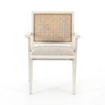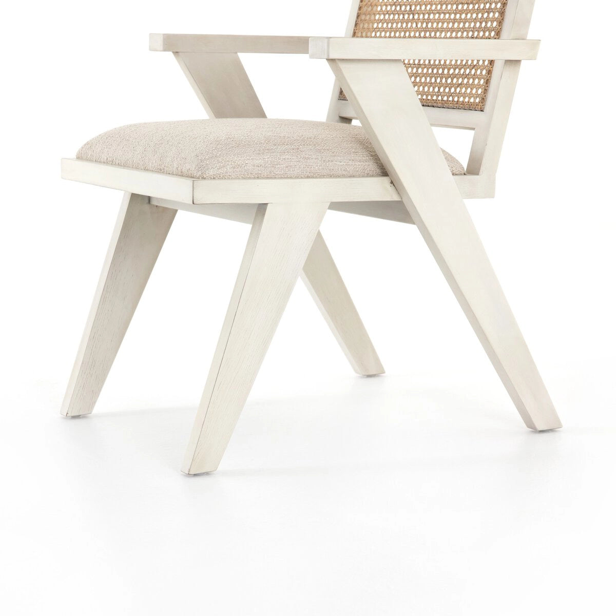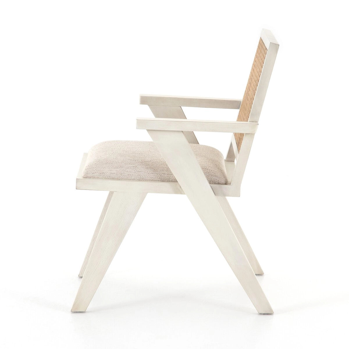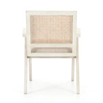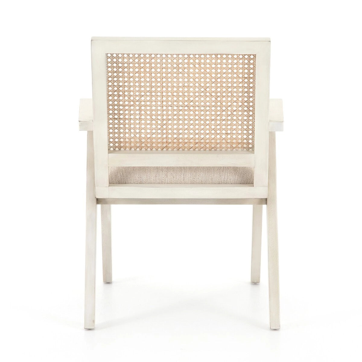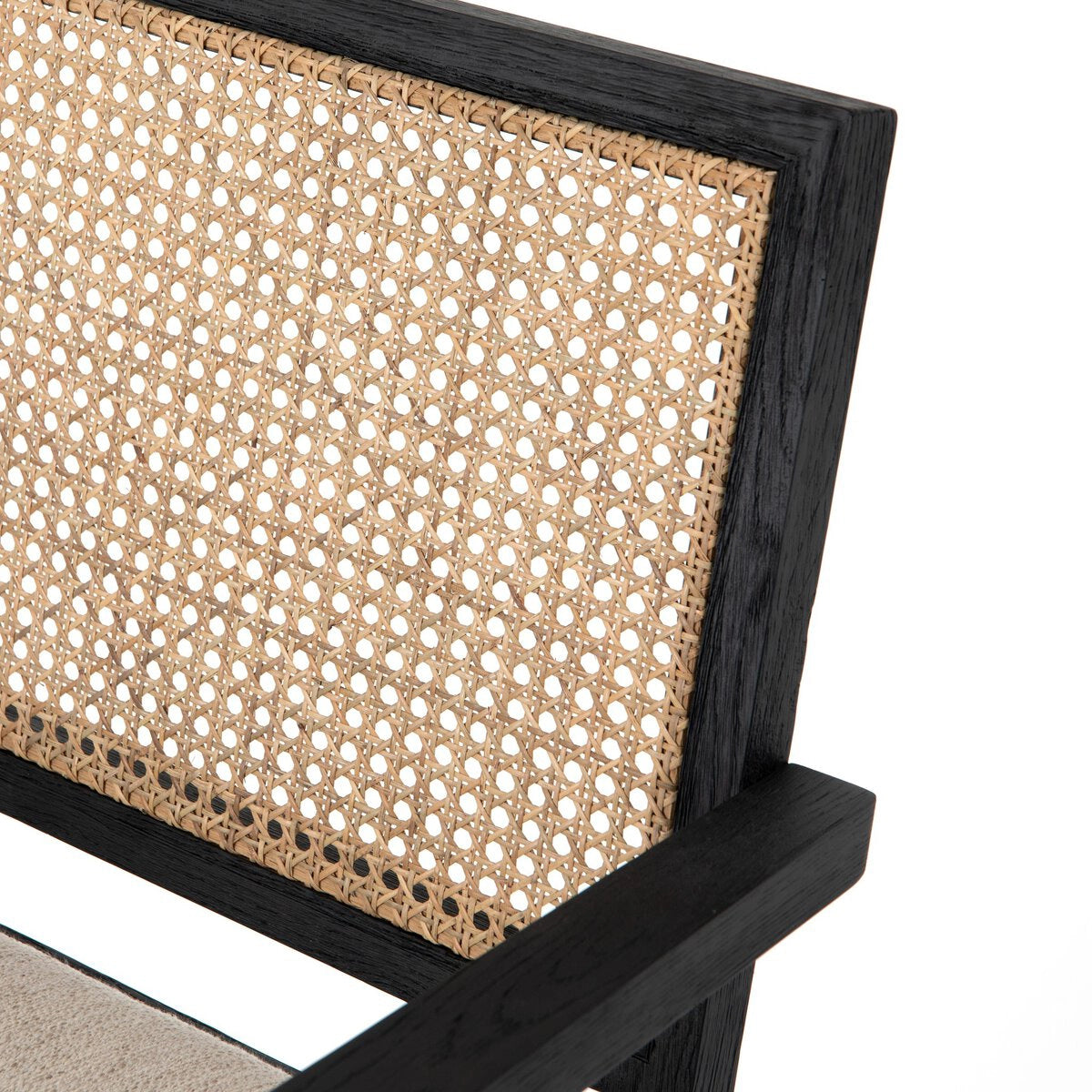 Inspired by Swiss-French architects Le Corbusier and Pierre Jeanneret, a monochromatic dining chair features solid oak framing, with woven cane seating, for a texture-driven look with mid-century vibes.