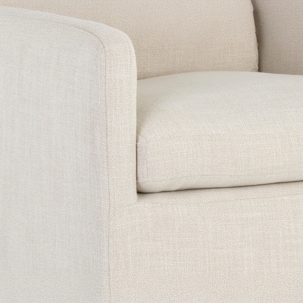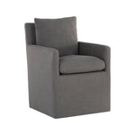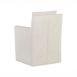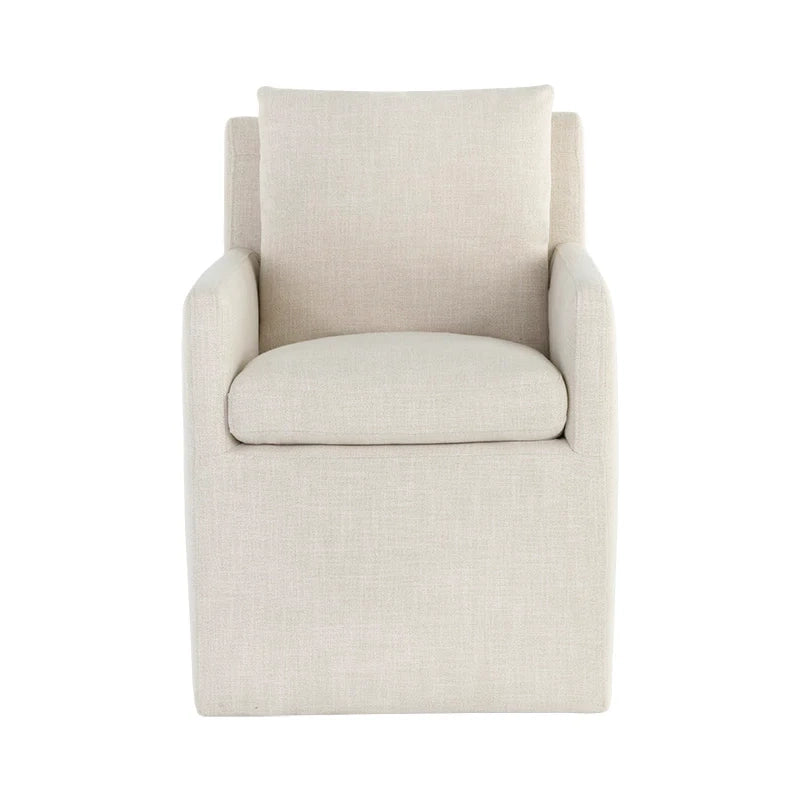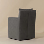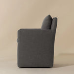 A formal and comfortable wheeled dining armchair that is full of classic appeal. Stocked in effie smoke and linen fabrics. Also available in an armless dining chair version. As this piece features feather-filled cushions, occasional rotation and fluffing is required to maintain its lasting comfort and beauty.