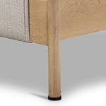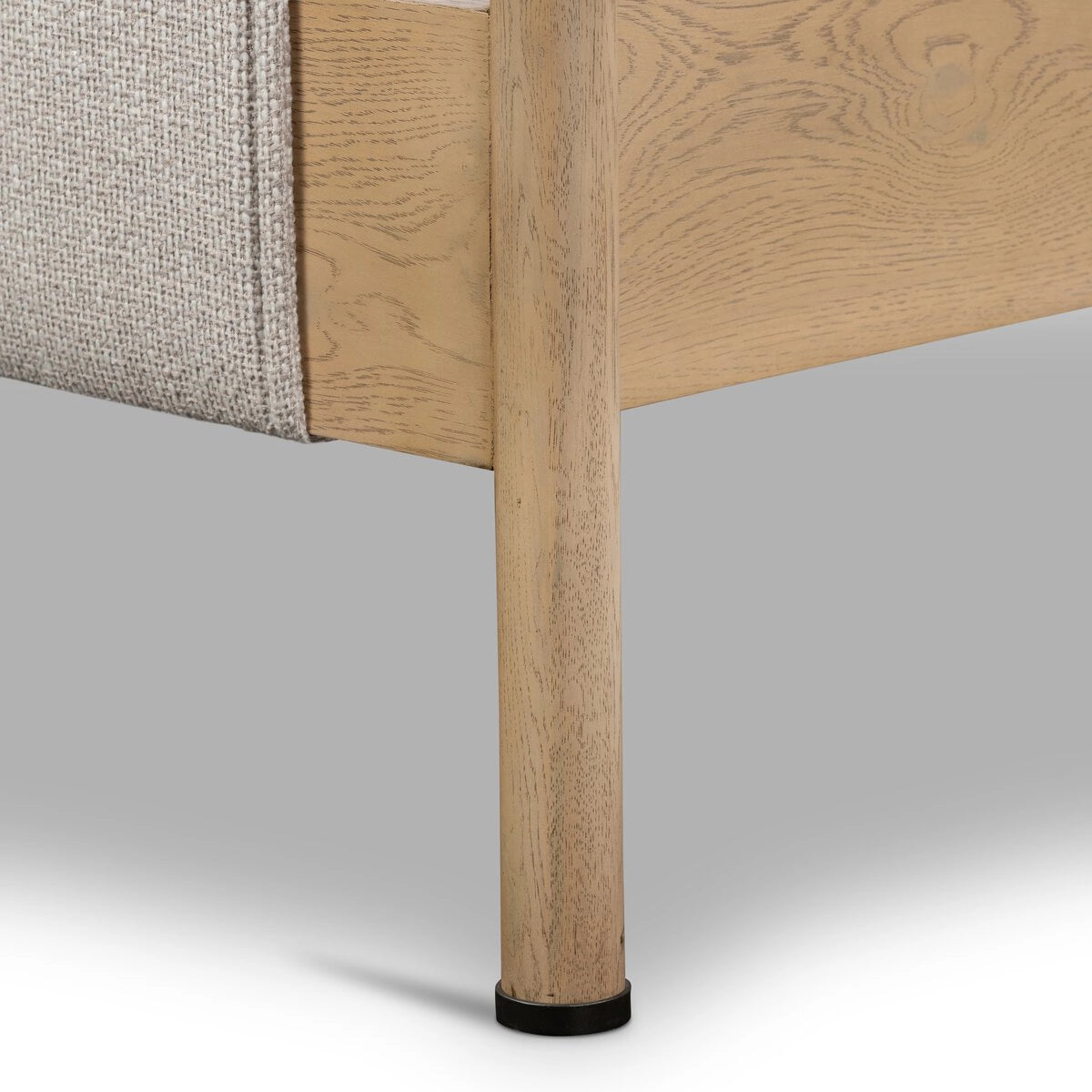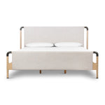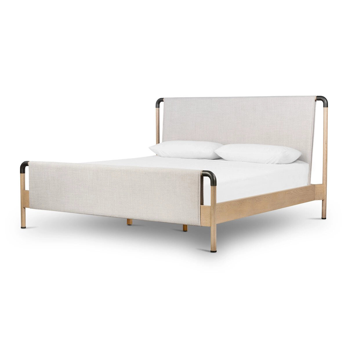 Mixed materials make the bed. Framed by solid oak with rounded iron corners, an upholstered, sling-style headboard brings a light, modern vibe to the bedroom. Performance fabrics are specially created to withstand spills, stains, high traffic and wear, ensuring long-term comfort and unmatched durability.