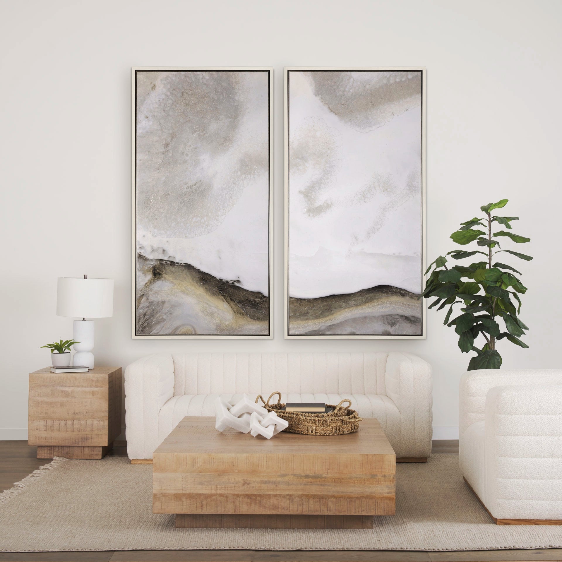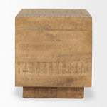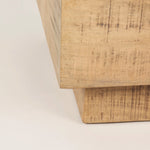 The light brown Hayden Square End/Side Table features a wooden box-like minimalist design on a recessed base, appearing as though it is "floating" in a room.