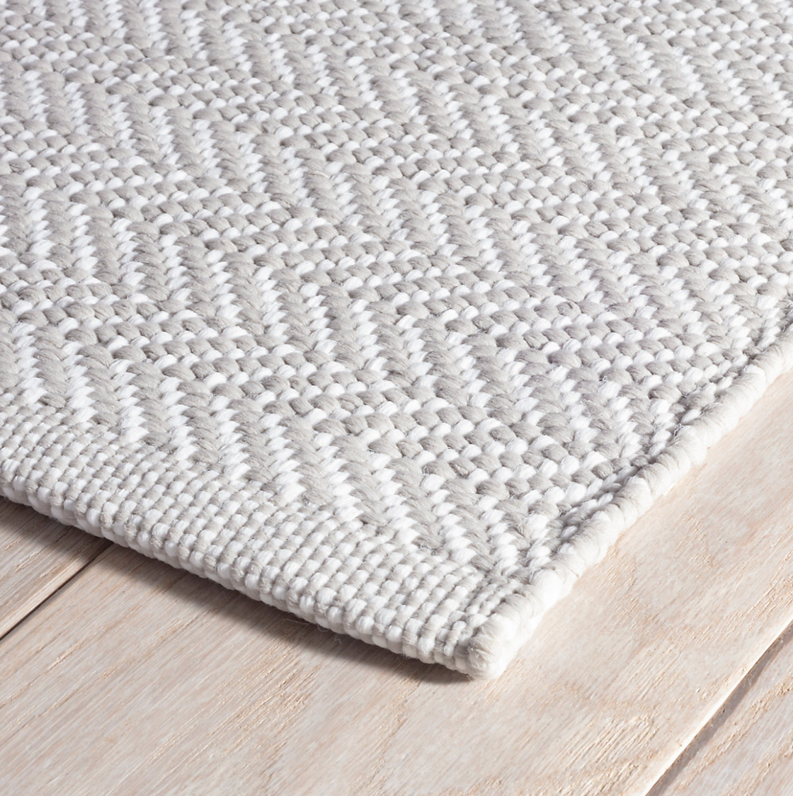 A grey and white herringbone pattern in durable and washable polpyproplyene is the perfect indoor/outdoor rug for any high-traffic area.