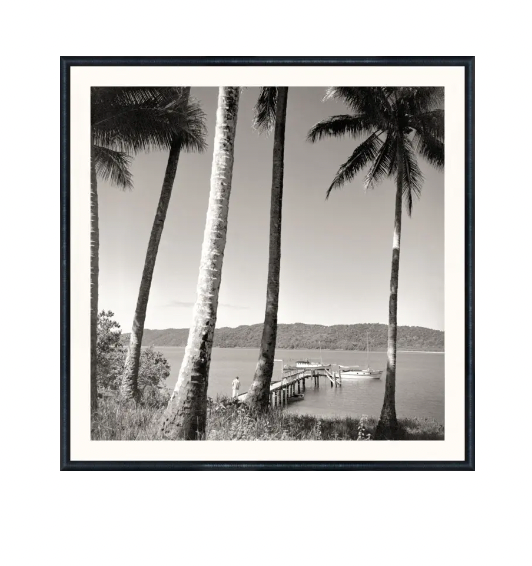 Idealized nostalgia, captured in black and white photography from the mid 20th century. Framed in a black moulding with a linear texture.