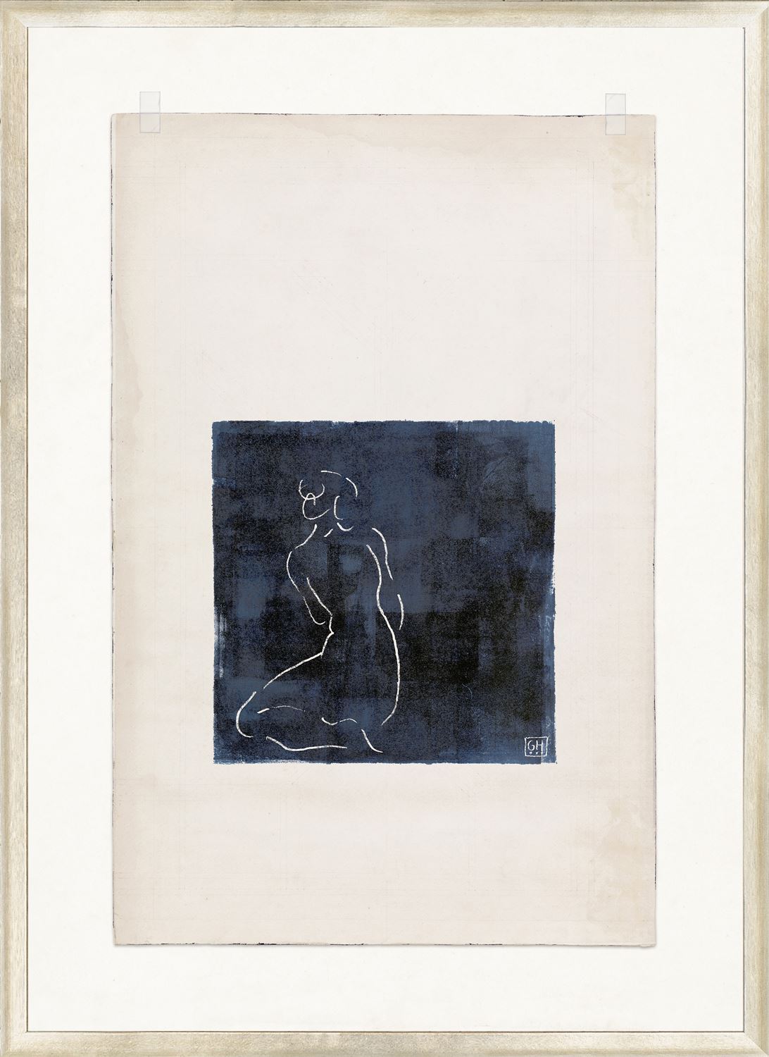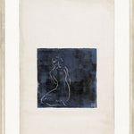 Delicate figurative drawings executed on dark indigo ink rolled surface create a lovely depth in this series of six images available in two sizes.