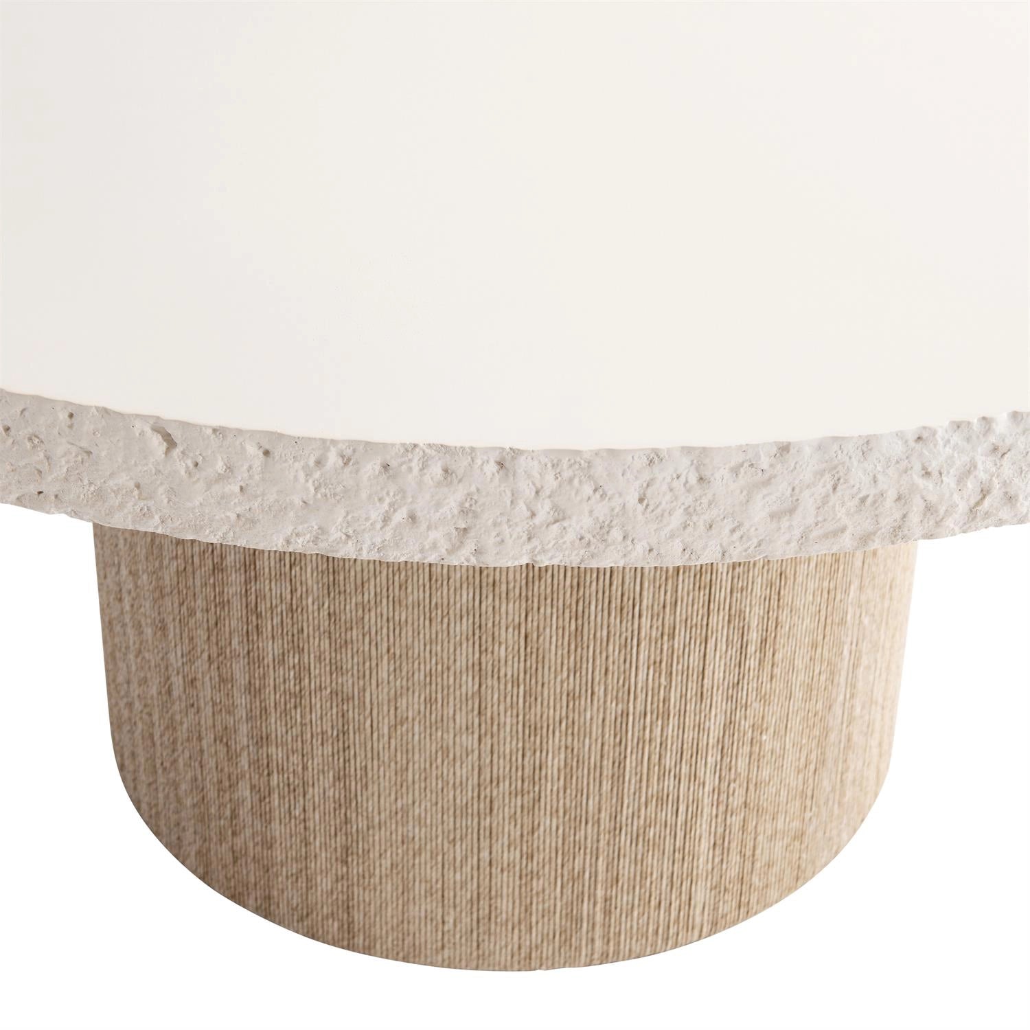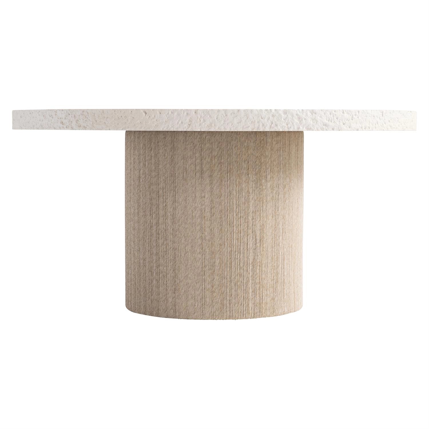 The base of the Kiona dining table is wrapped in twisted rope in the Sandbar finish, giving it an organic textural design. The base supports a top of cast resin in the Crema finish with a smooth surface and chiseled edge.