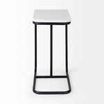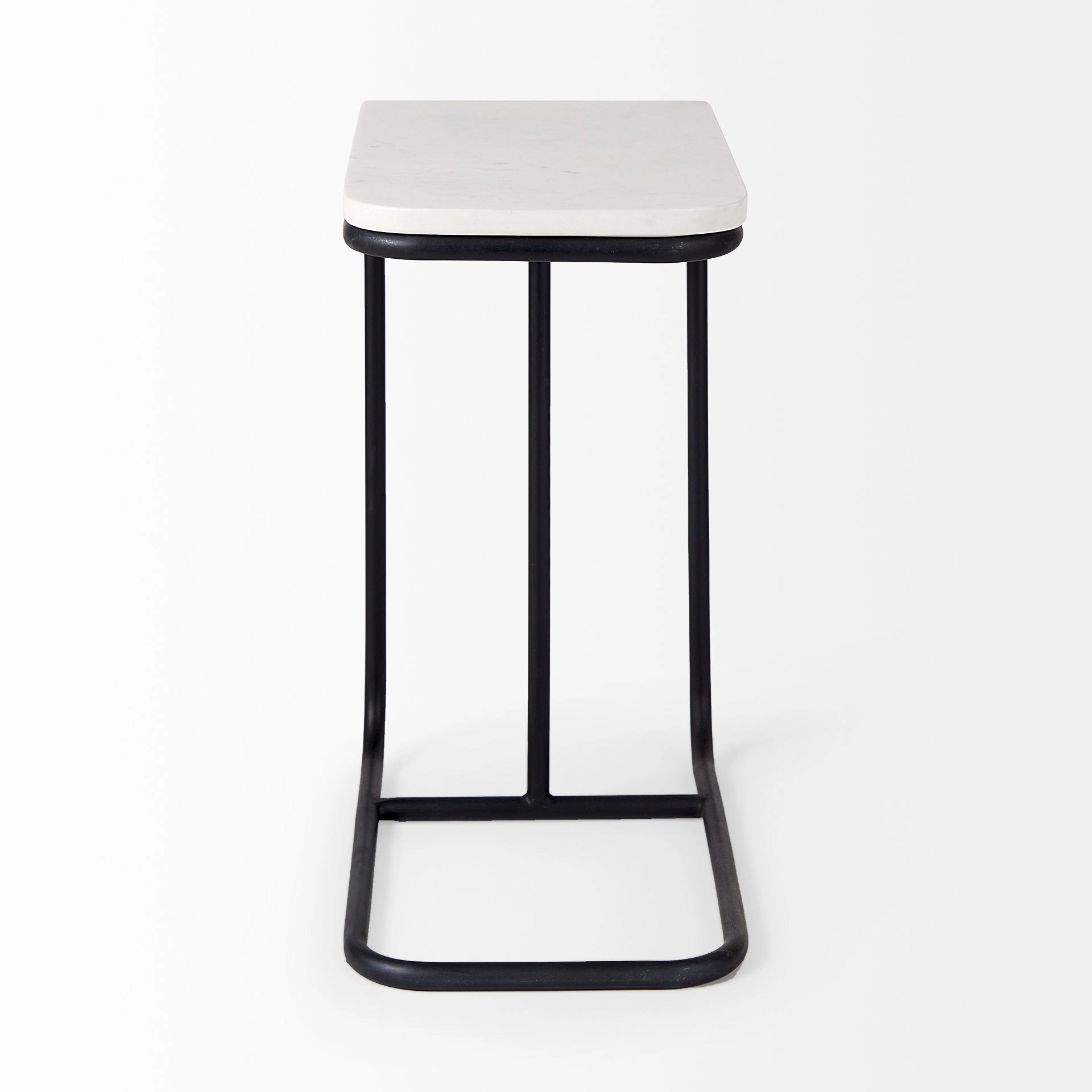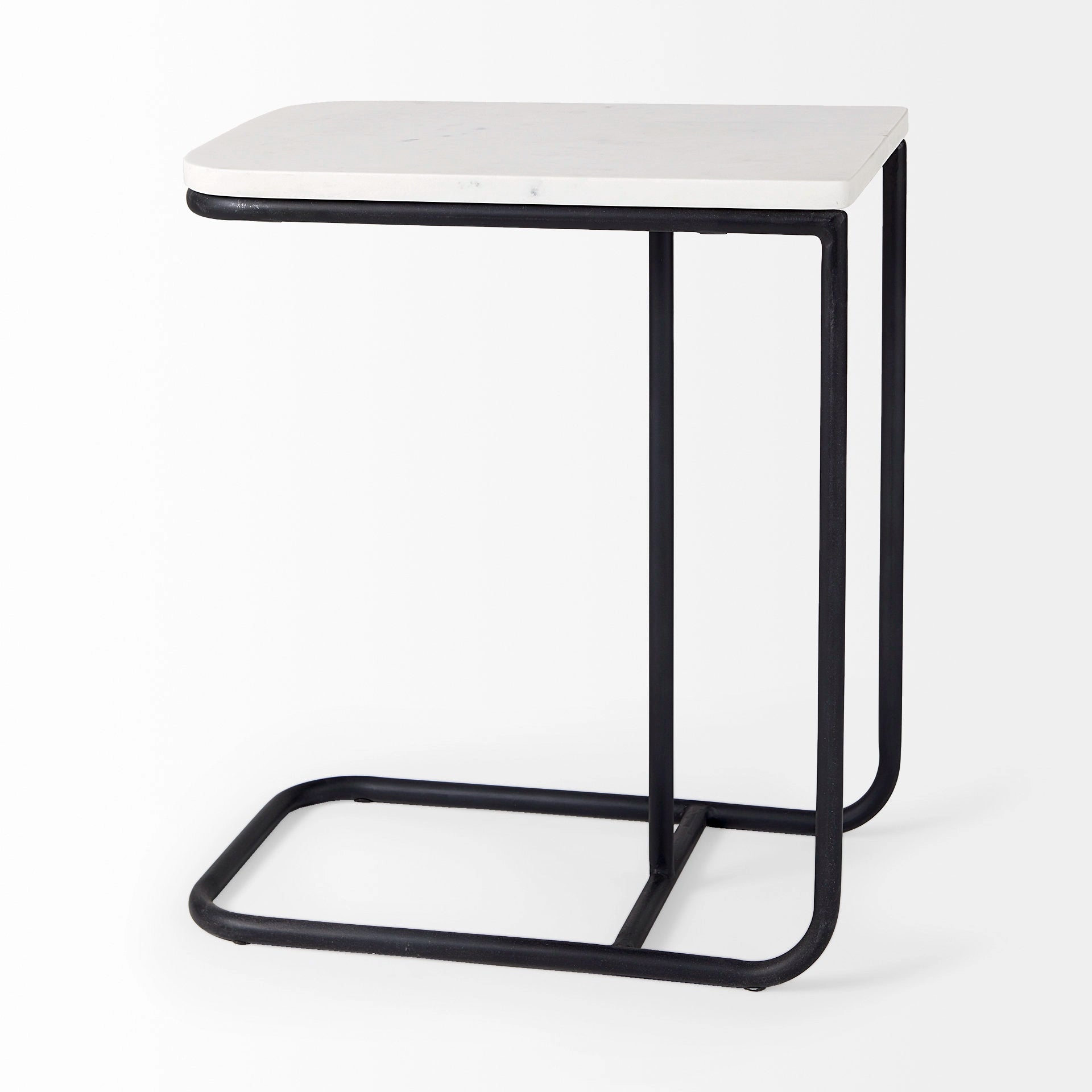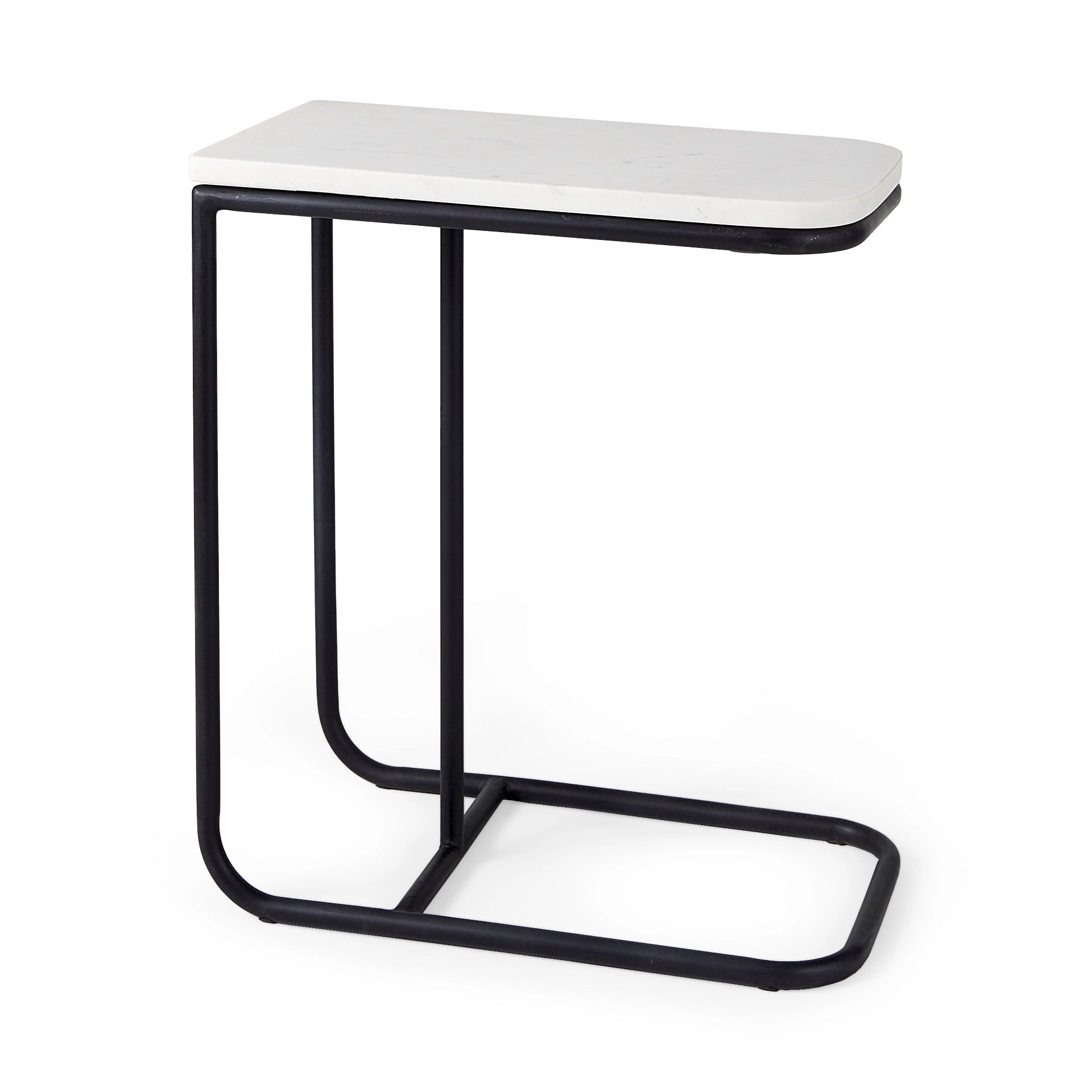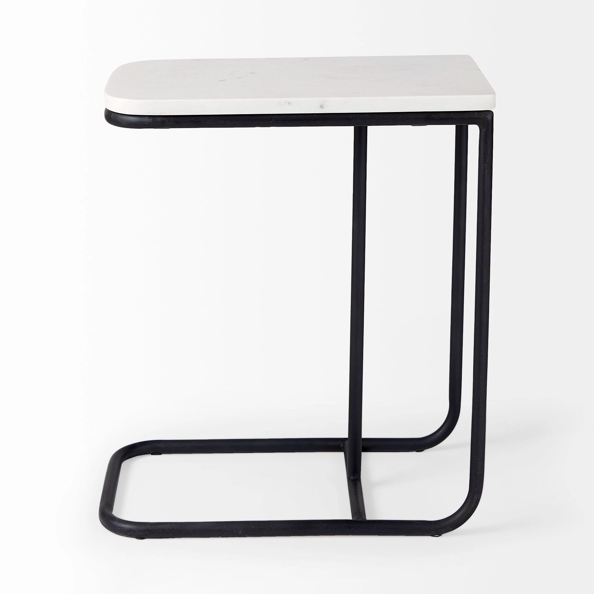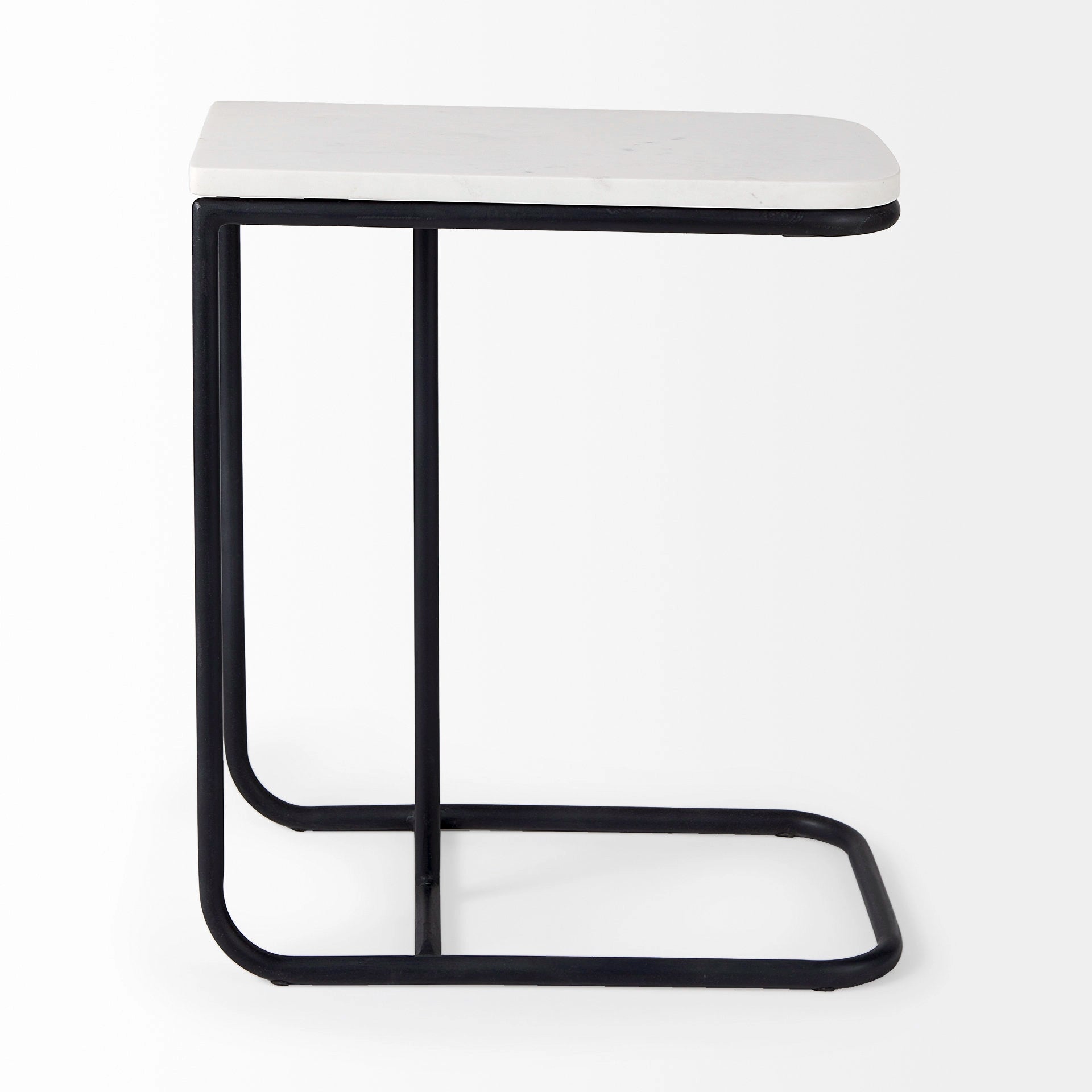 A C-shaped table that epitomizes minimalistic appeal with its clean lines. This table features an iron base with a matte black finish, which supports a white marble top