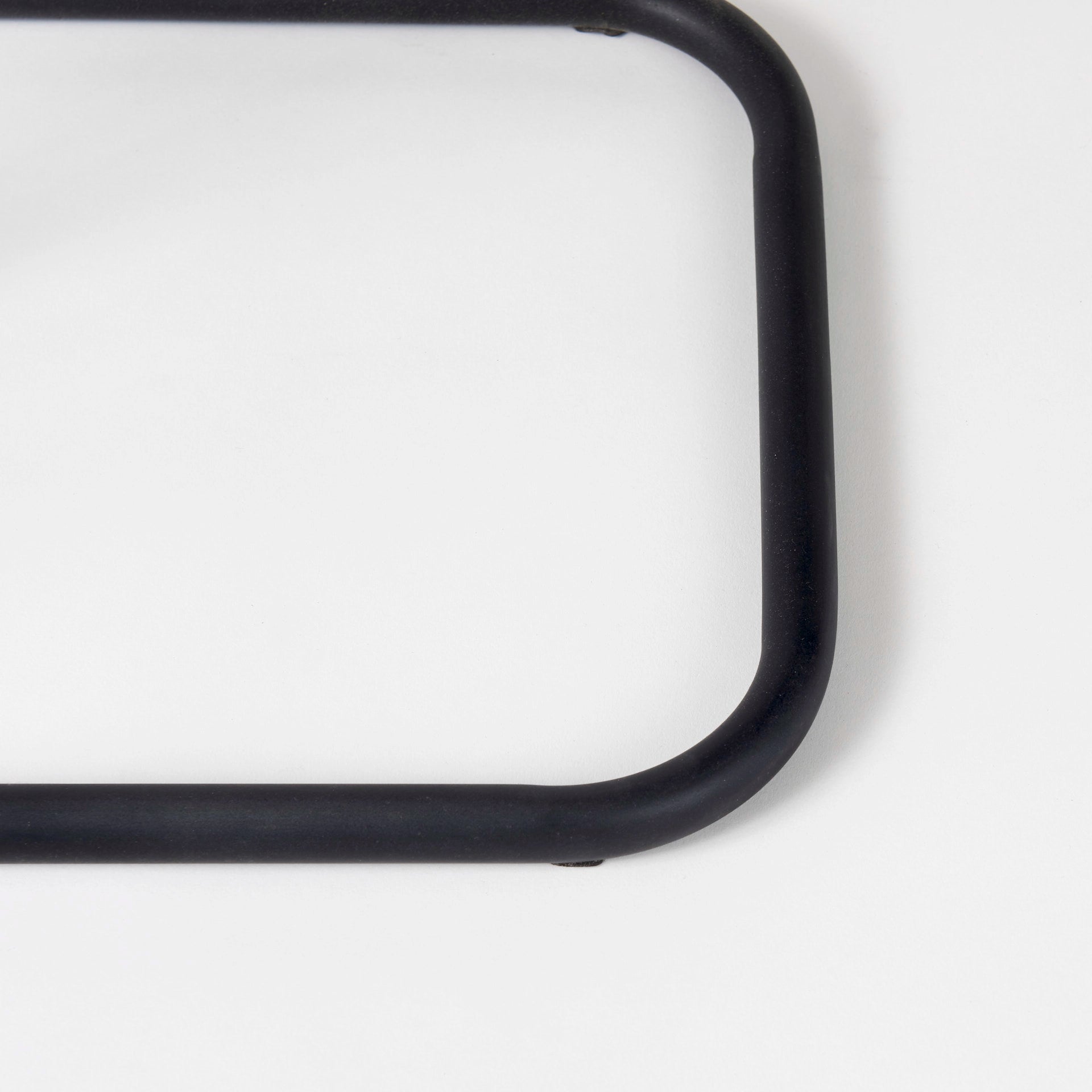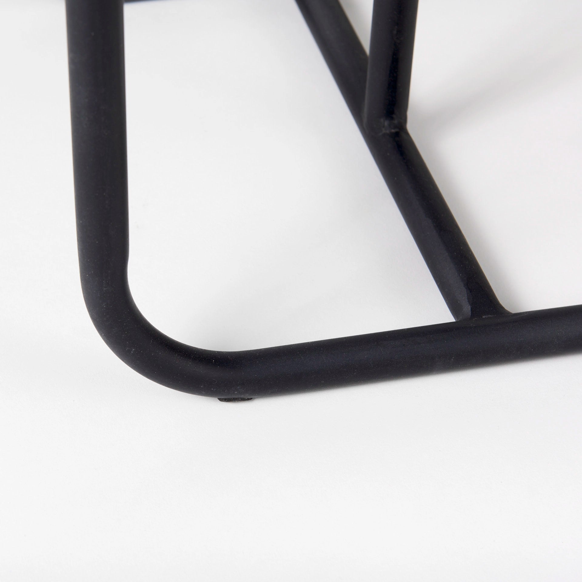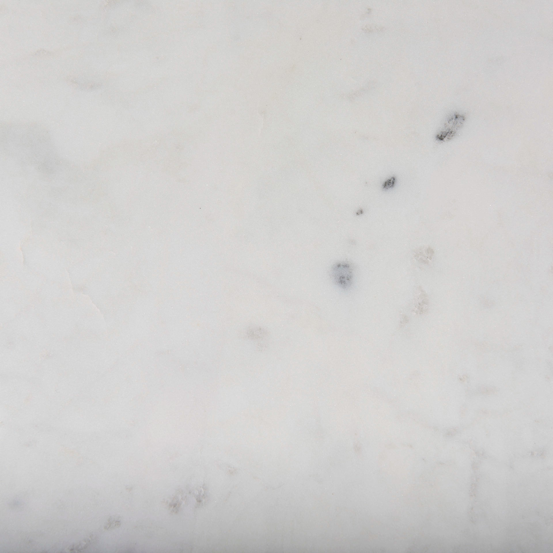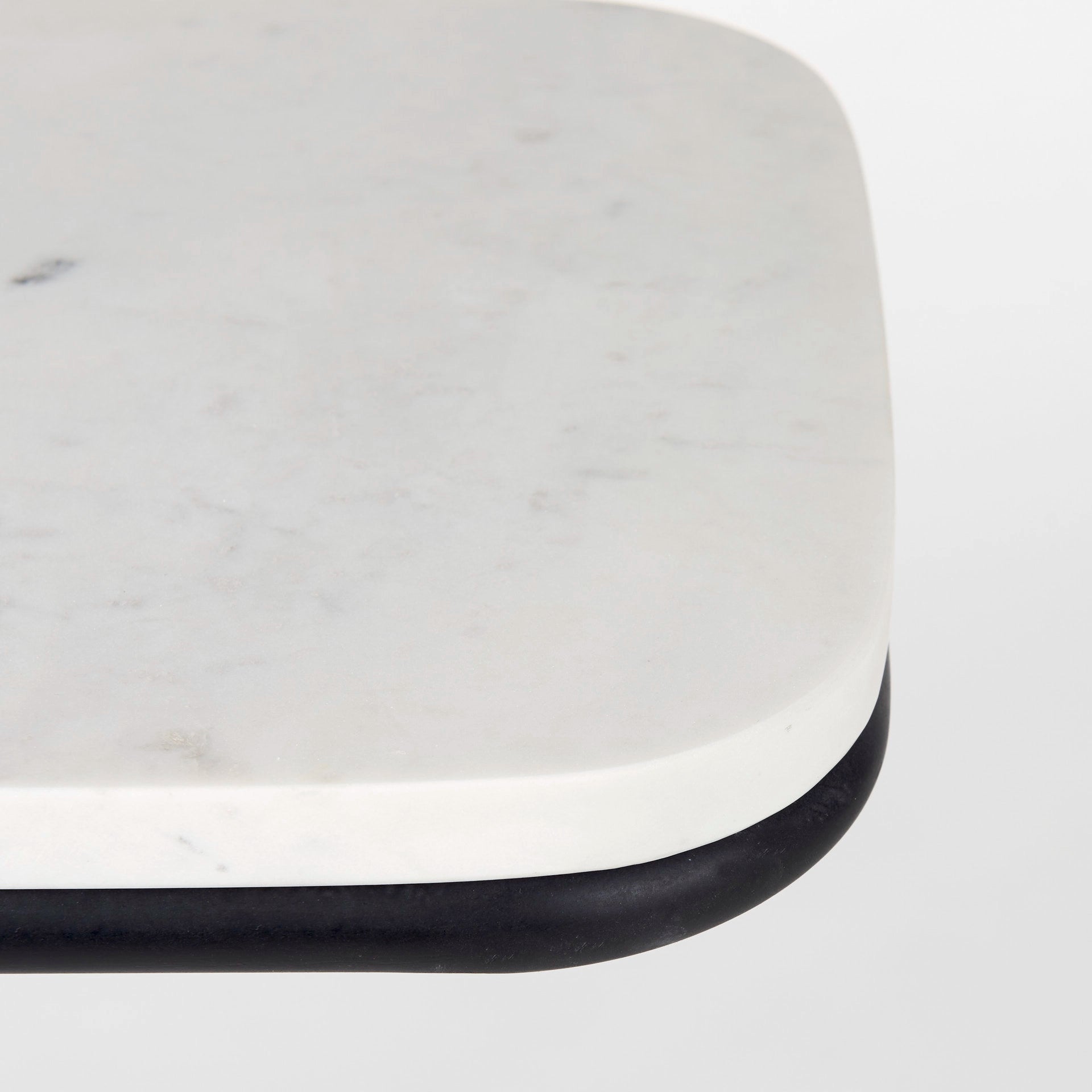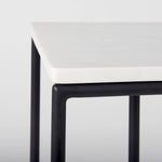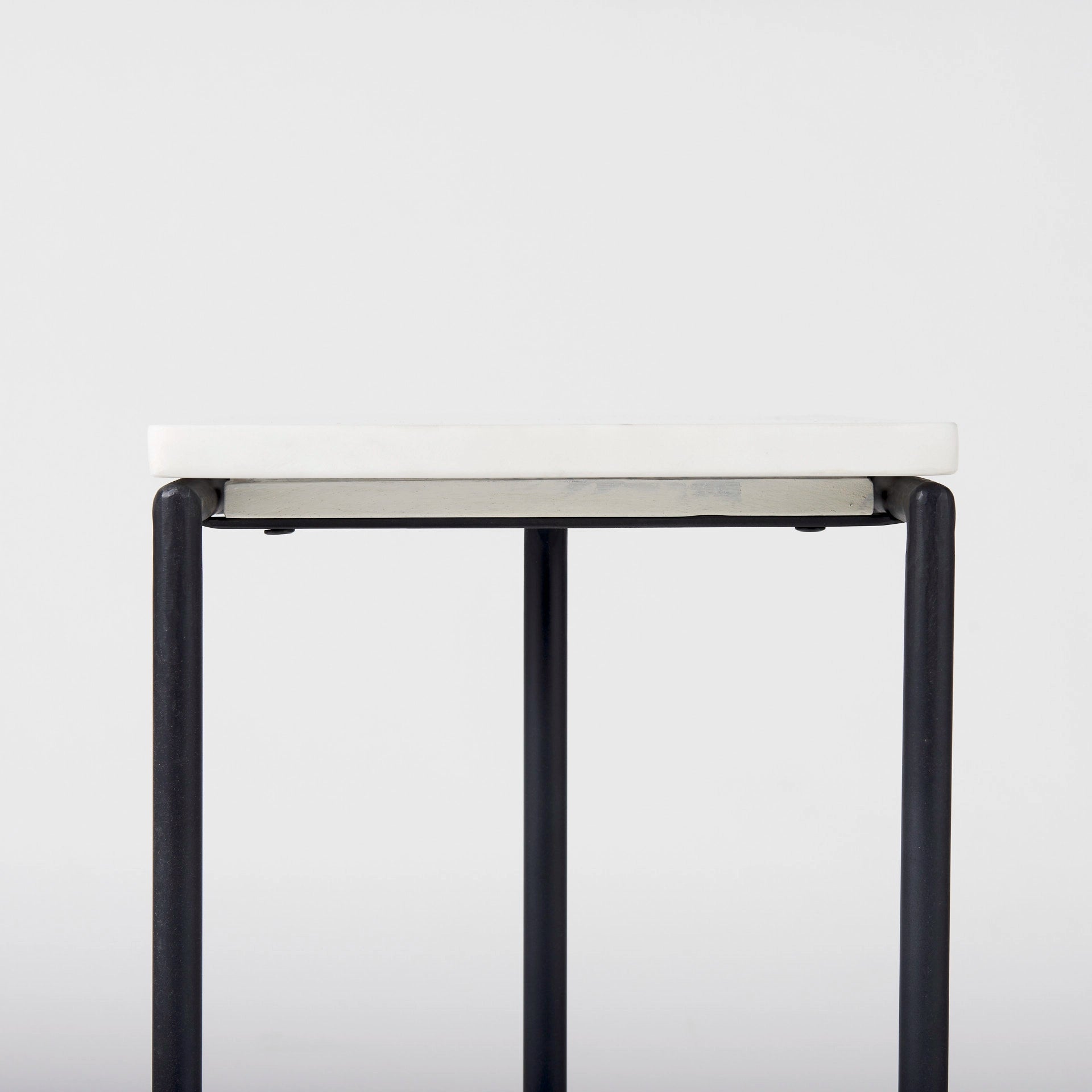 A C-shaped table that epitomizes minimalistic appeal with its clean lines. This table features an iron base with a matte black finish, which supports a white marble top