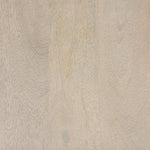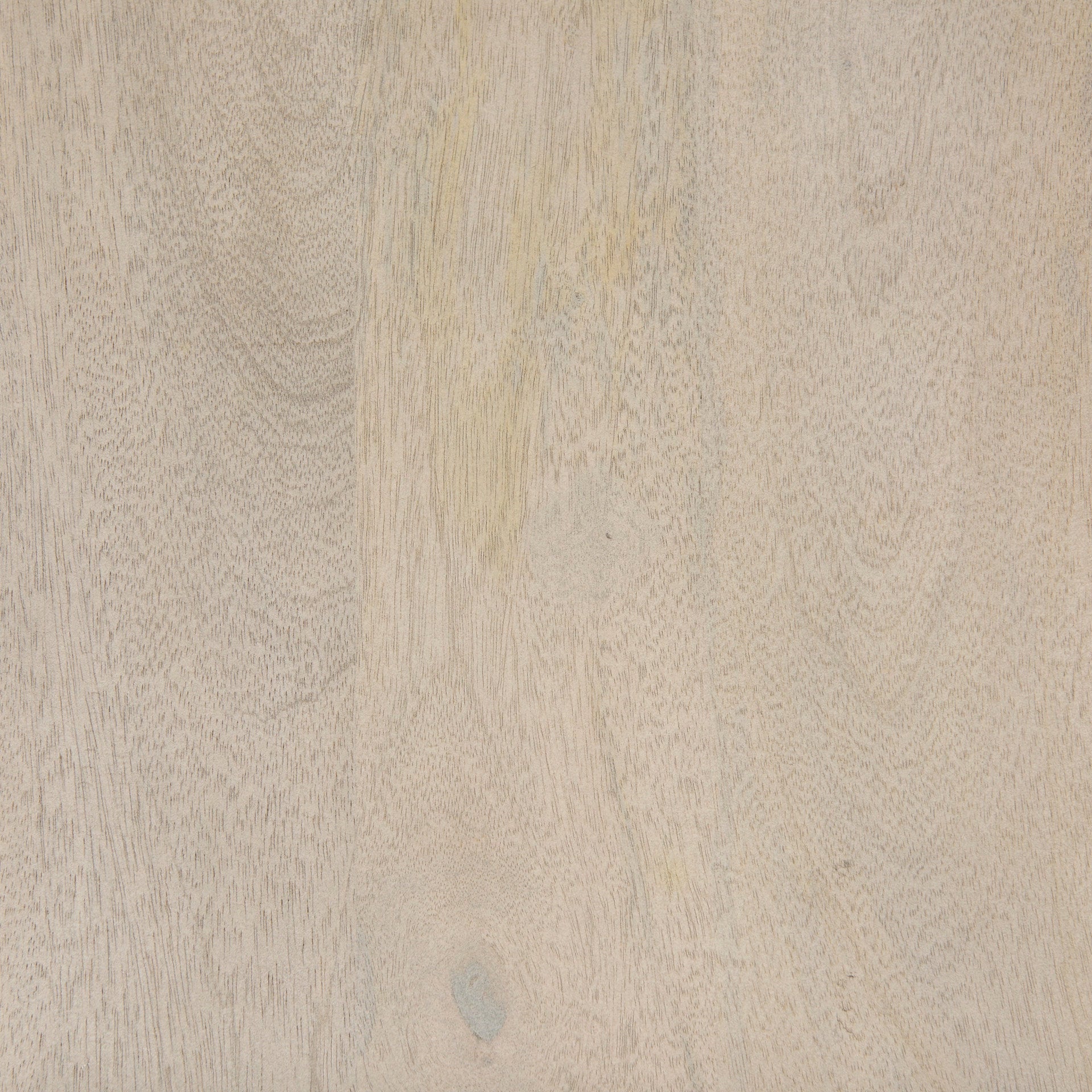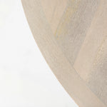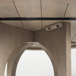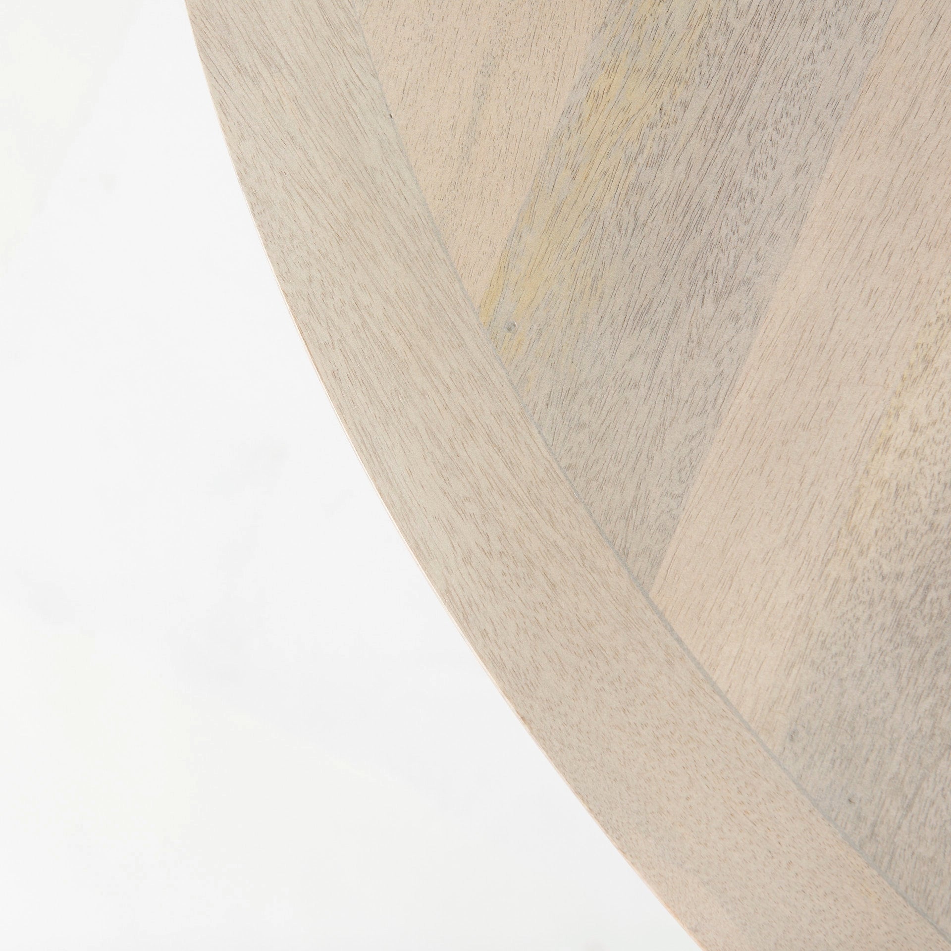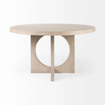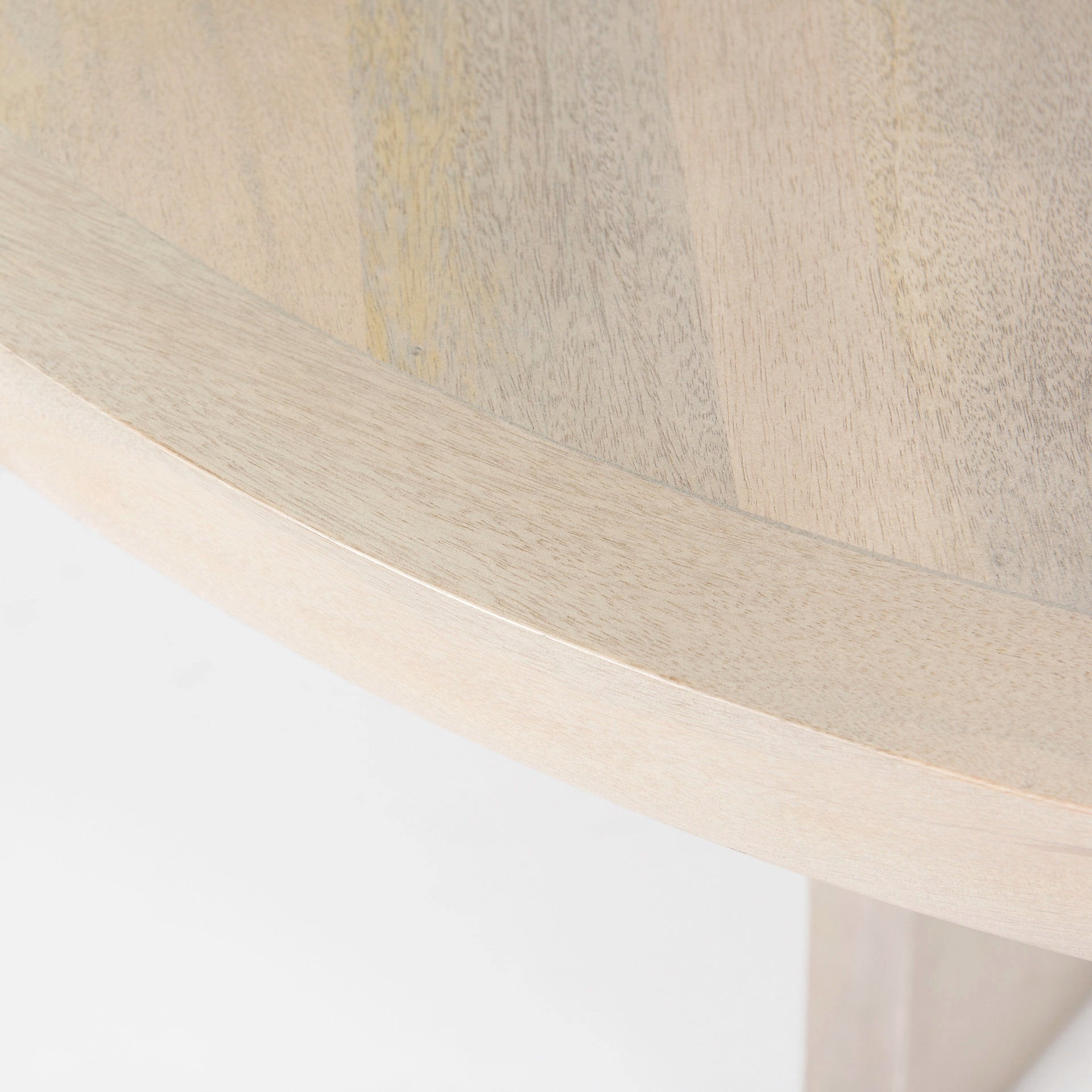 The Liesl is a round natural toned dining table made from solid Indian mango wood featuring a geometric base.