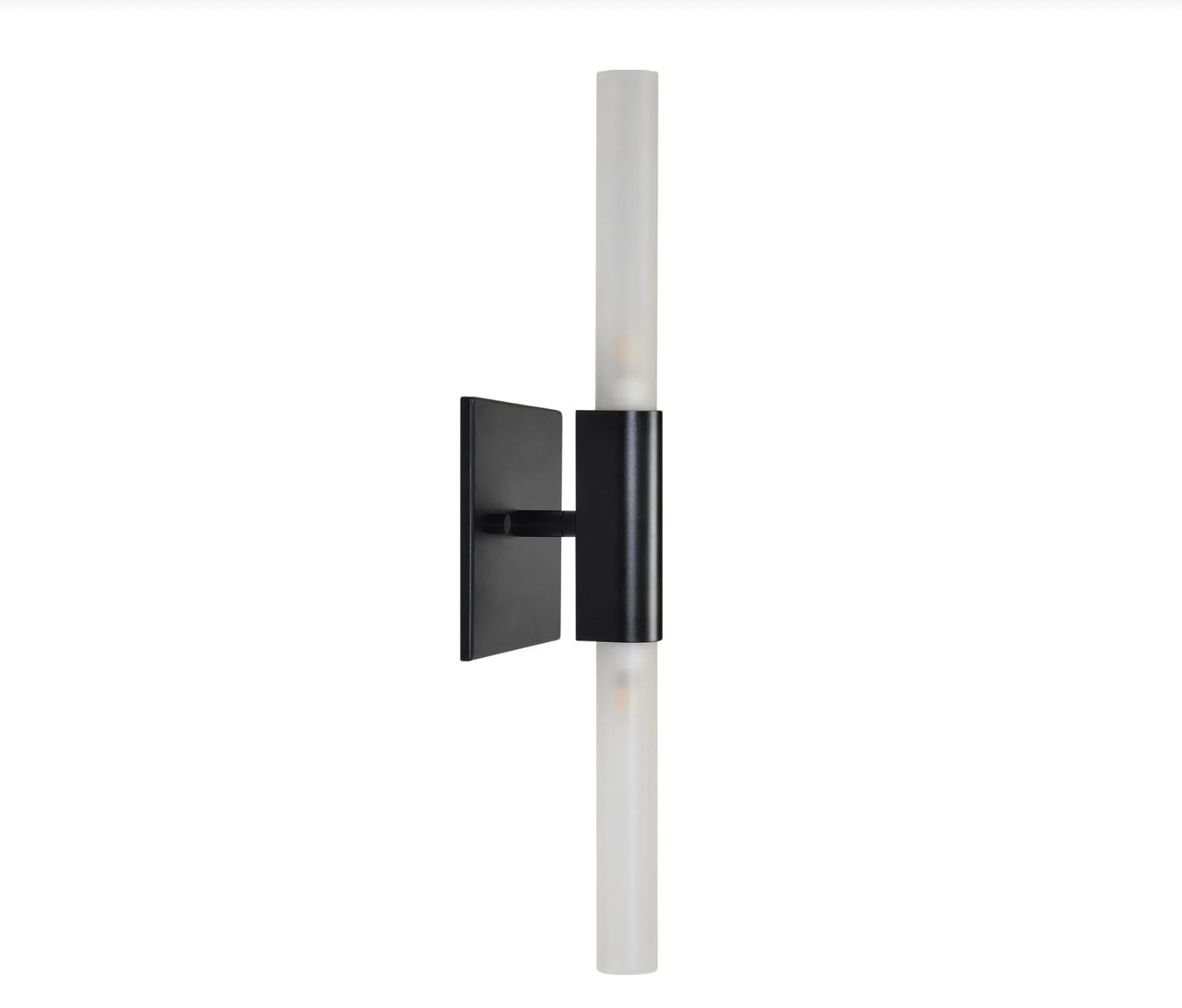 A narrow space in the home is filled with style and light with this sconce. The matte black painted iron structure lends itself well to the industrial interior, as the smooth angles feel fitting within a contemporary design as well. The etched white tubular glass has a soft quality when unlit and displays a warm glow when lit.