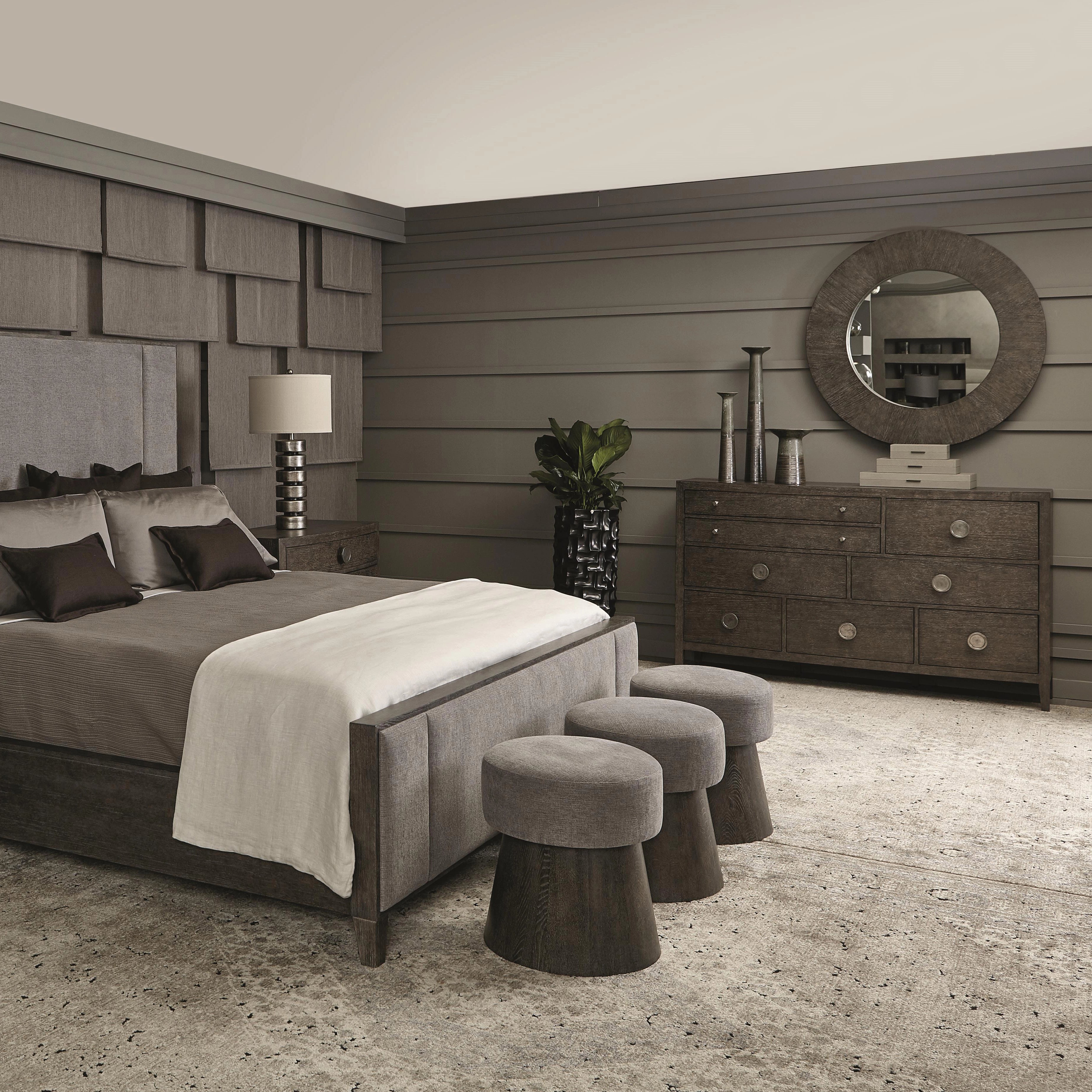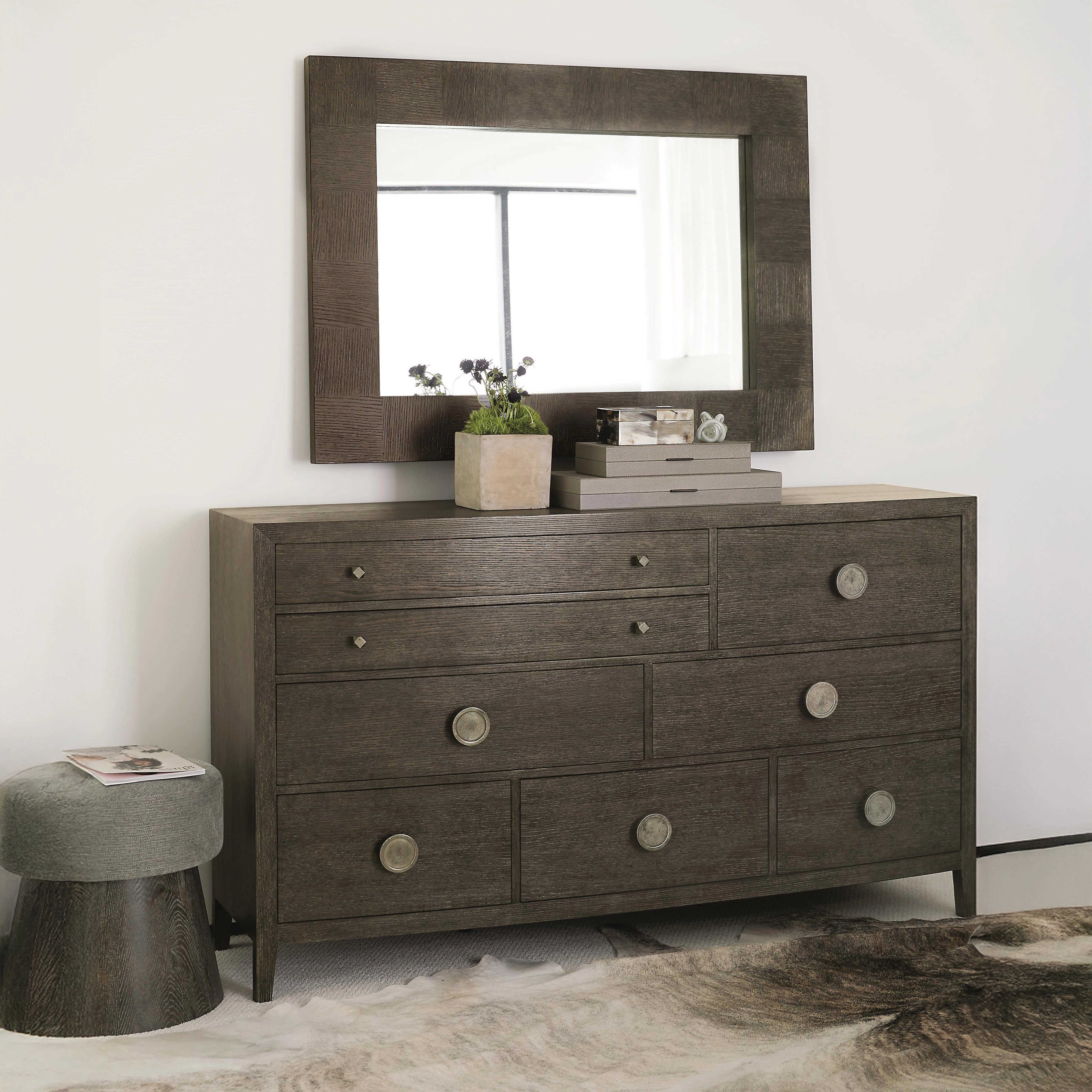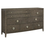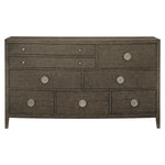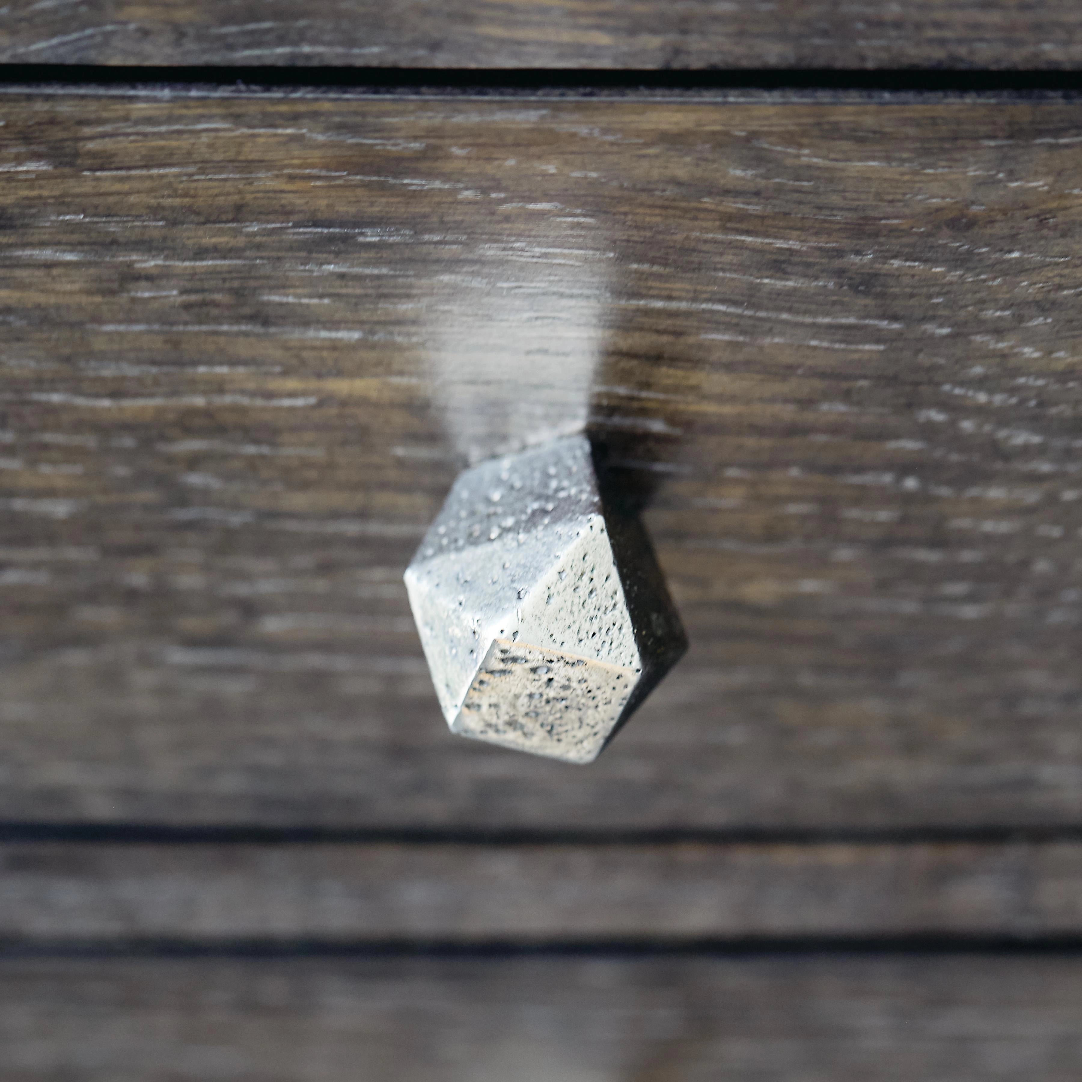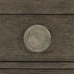 A rustic modern dresser distinguished by its asymmetrical form, laid-back finish and heavily textured metal hardware.