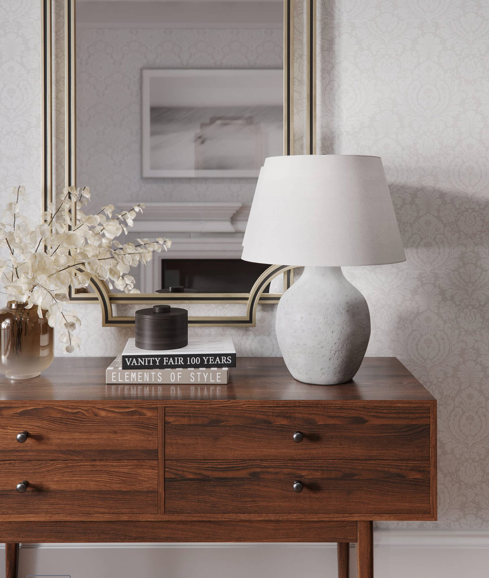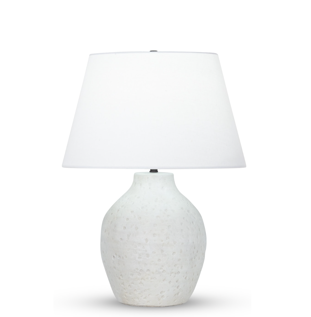 An all-white look is still multidimensional thanks to the beautiful texture on the body of this ceramic table lamp. Abstract carvings create an antique quality, while the off-white cotton shade makes the look modern. Brighten up a modern bedroom with two of these lamps flanking the bed.