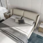 The Margot bed is a fully upholstered bed, offering a choice of legs in white oak or American black walnut. Its enveloping headboard adds a touch of elegance to your bedroom.