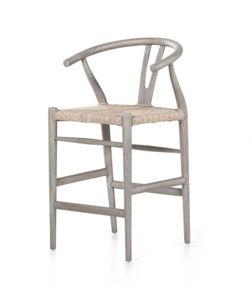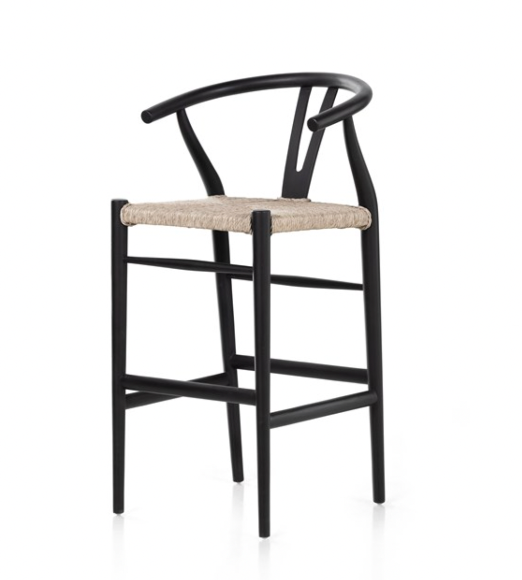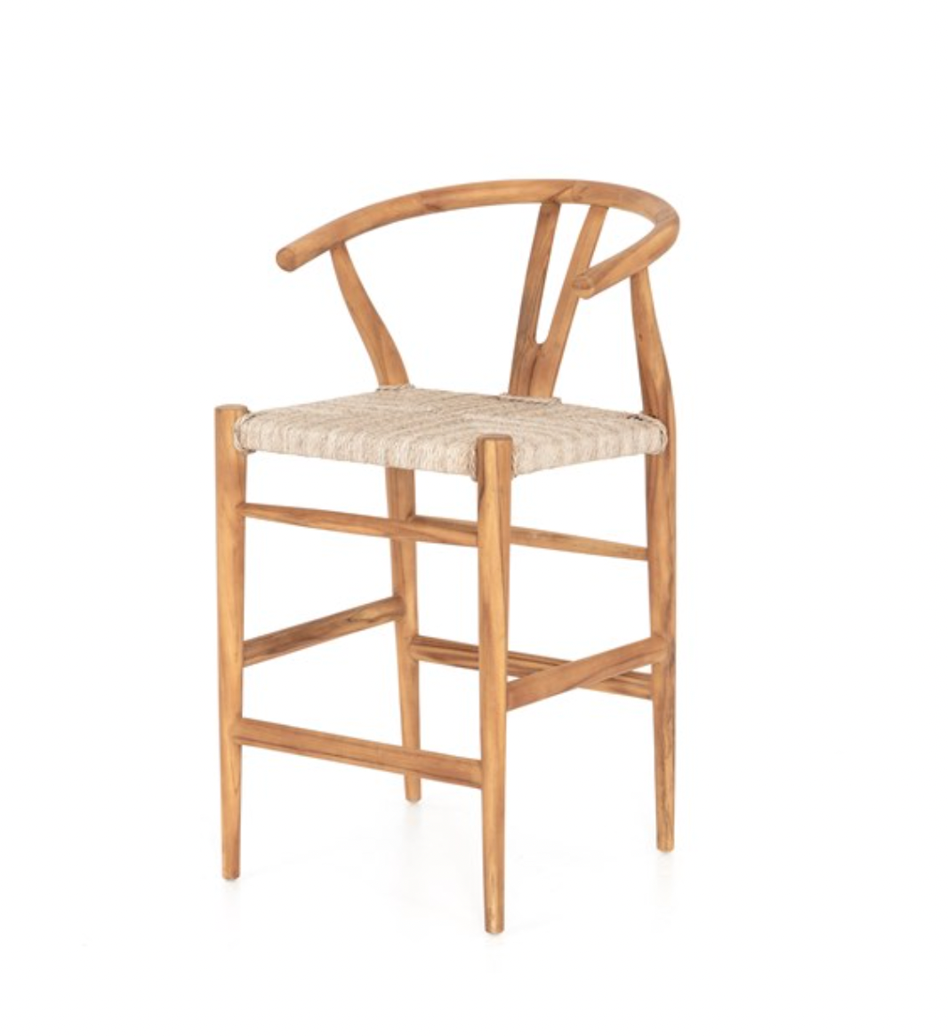 Modern curves redefine the classic wishbone-style bar stool. Vintage white all-weather wicker is woven for texture and contrast against black teak framing.