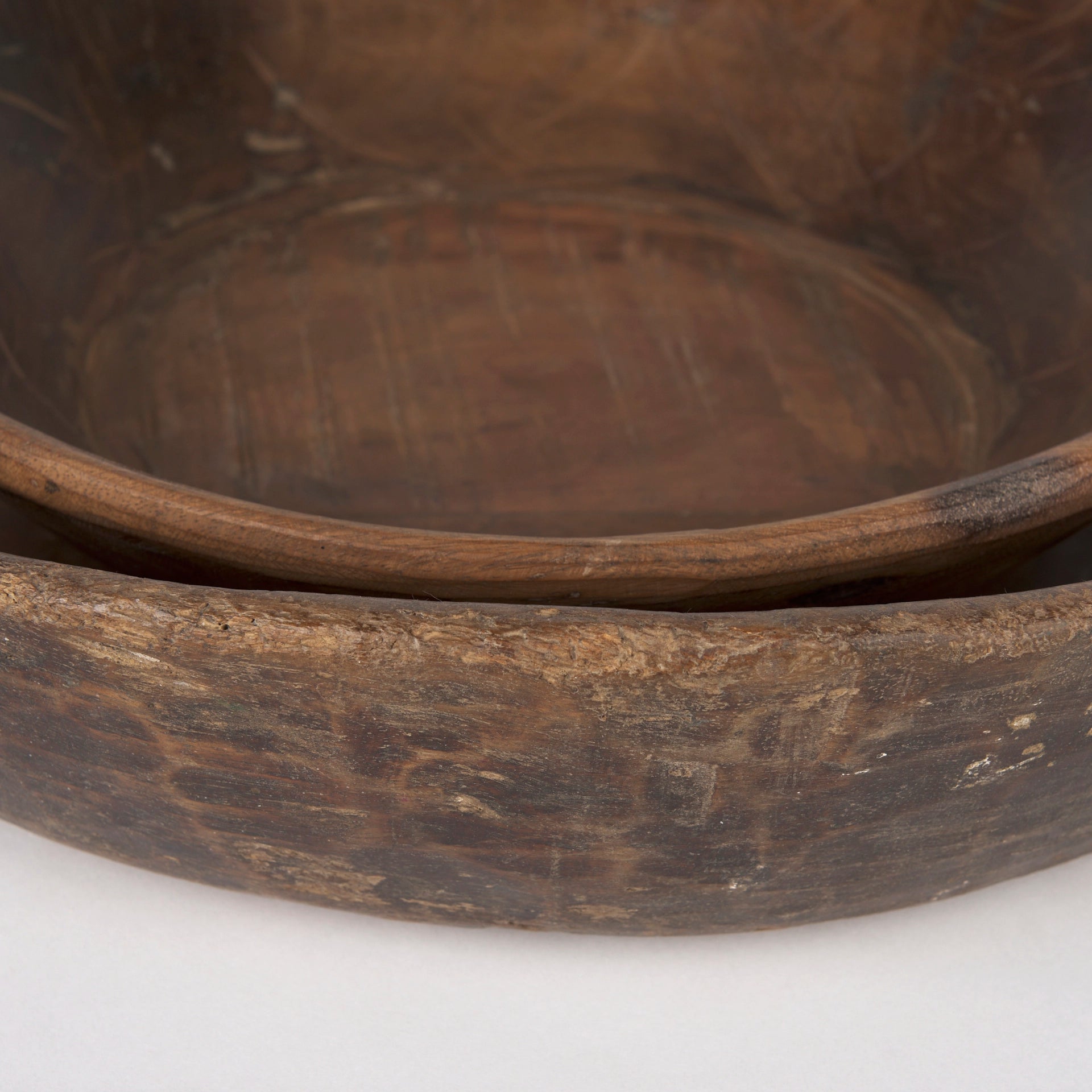 Set of 2 bowls made out of solid reclaimed wood finished in blends of rich medium and dark brown stains.