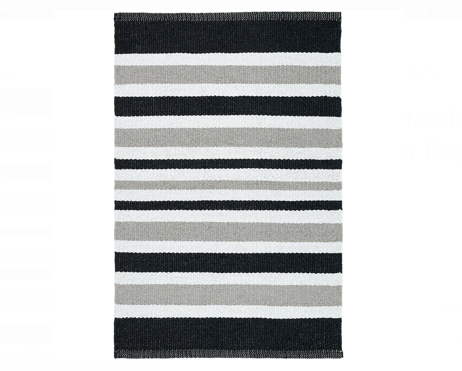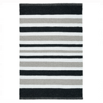 This graduated stripe flat-weave rug in Black, Khaki and White has passed all the tests with high honor's! Available in a variety of modern markings, our latest matte PVC Indoor/Outdoor rug breed is light and dense with good stability. It lies flat and stays put with the look and feel of a natural fibre. Because it is water resistant, it exhibits the same easy clean up qualities, and stain and mildew resistance, as our other performance rugs. Crafted by artisans committed to fair-labor practices.