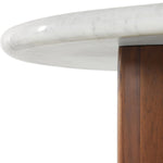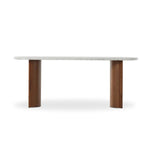 A study in shape. Seasoned brown acacia forms the crescent-shaped legs of this console table, topped with Italian white marble to bring an organic presence to the living room or entryway.