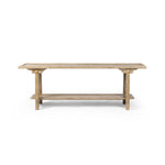 This Asian-inspired design made from light, distressed oak features mortise-and-tenon joinery, which connects protruding stretchers to sturdy legs. Lower shelving for bonus storage and display.