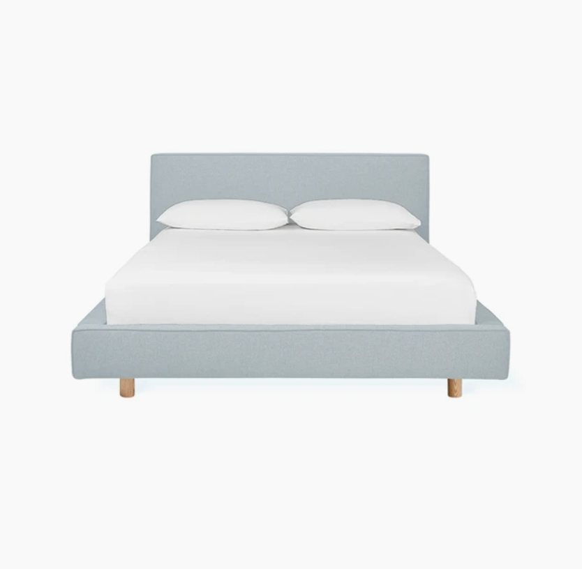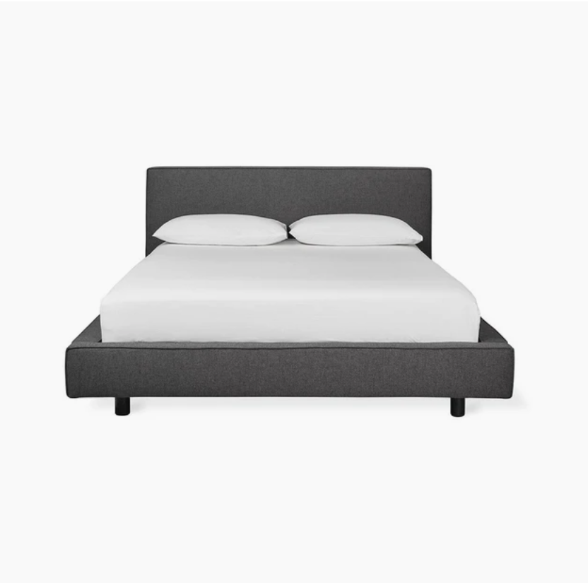 With its generous, soft surface area and sleek design, the Parcel is the quintessential modern platform bed. The squared-off headboard, side rails and footboard create a simple, sculptural modern frame, while French seams soften the look with classic detail. Supported by solid ash legs, Parcel seems to float, lending an airy quality that complements any bedroom interior. Available as a king or queen. Constructed with kiln-dried 100% FSC®-Certified hardwood in support of responsible forest management.