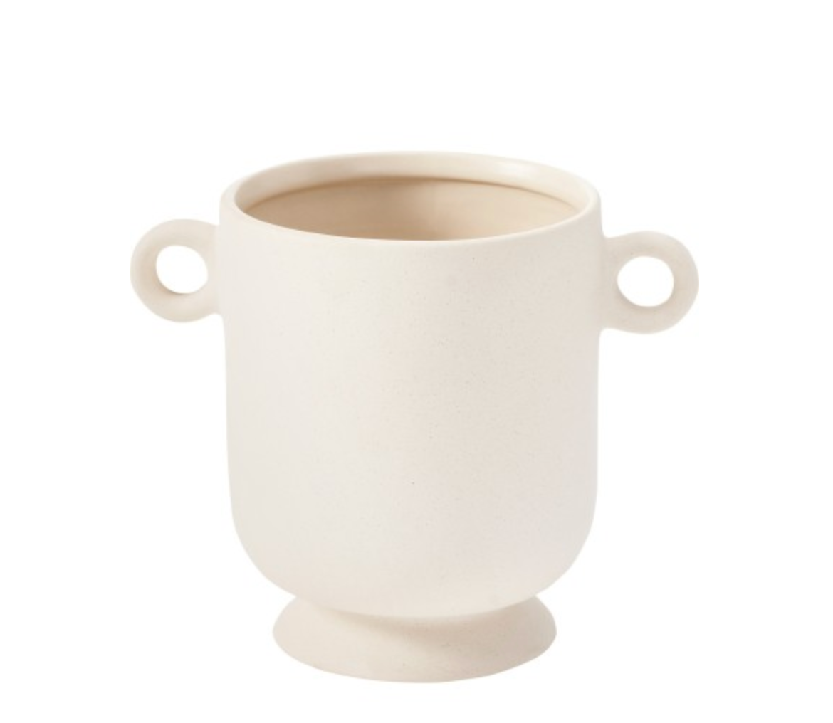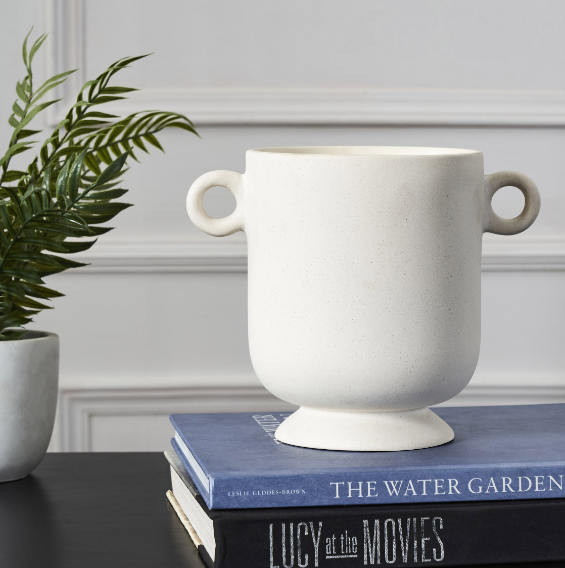 Matte cream ceramic stoneware emits an air of old-world architecture in this vase design. With a simple structure and smooth angles, it is pleasing to the eye at every passing moment. At 8.6 by 5.5 inches, it holds a small stature that is optimal for arrangement on a bookshelf or mantel.