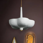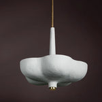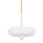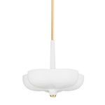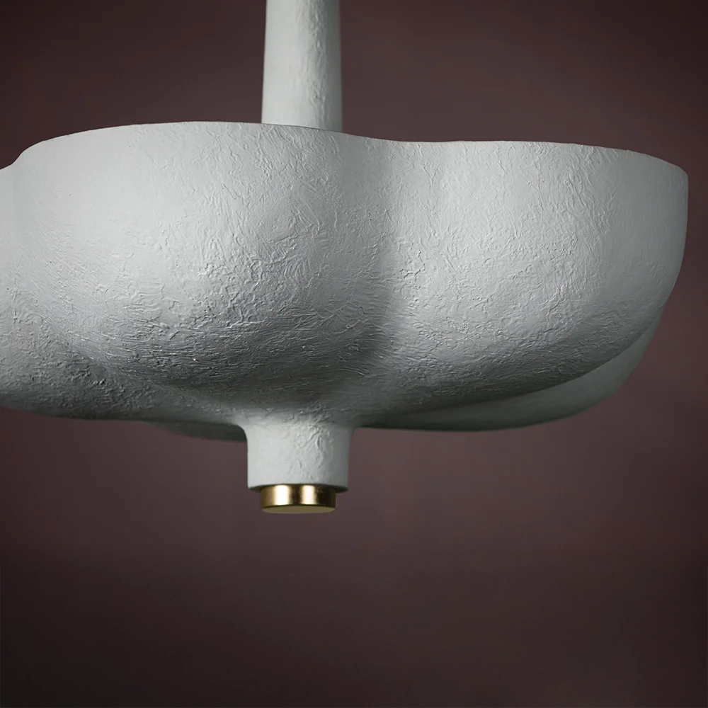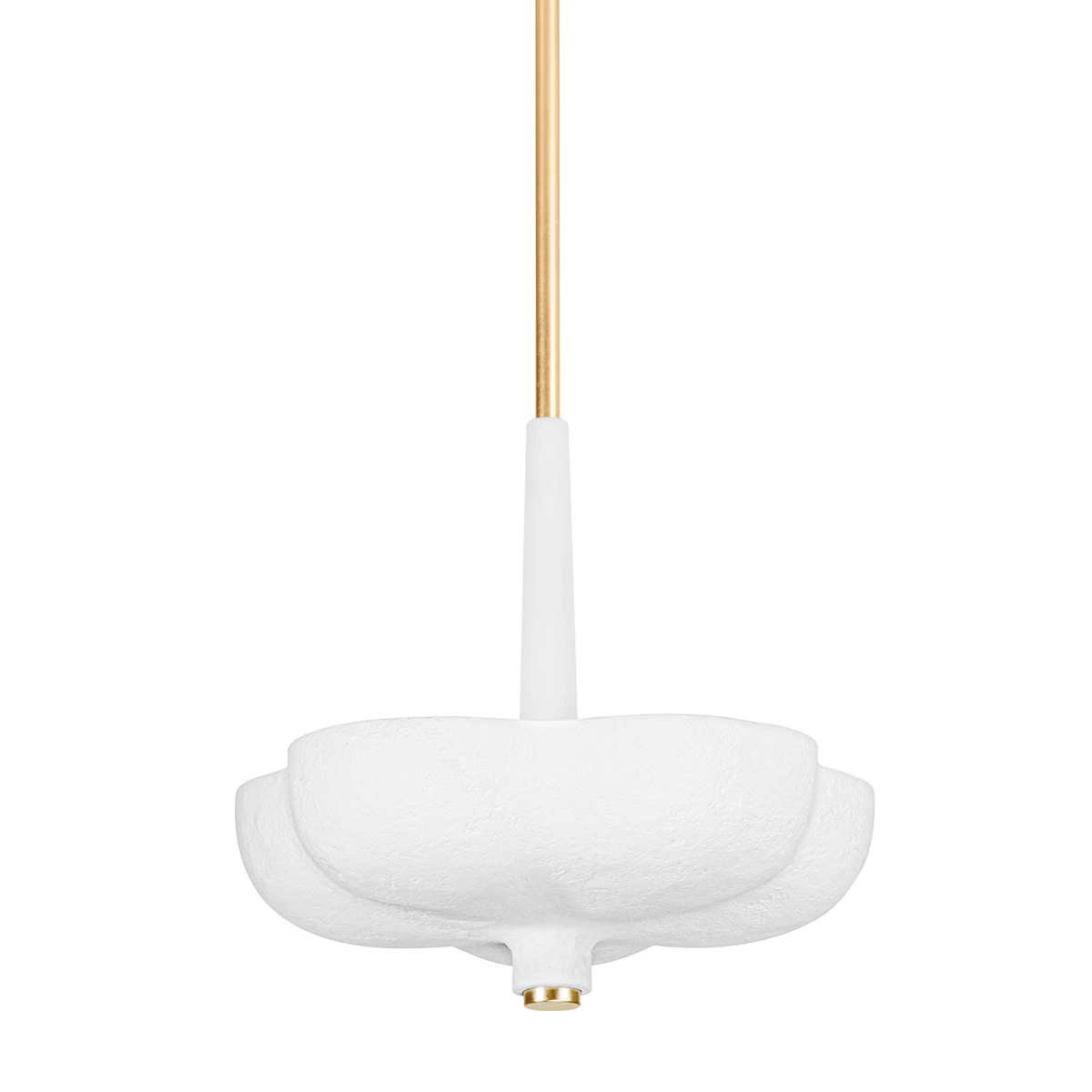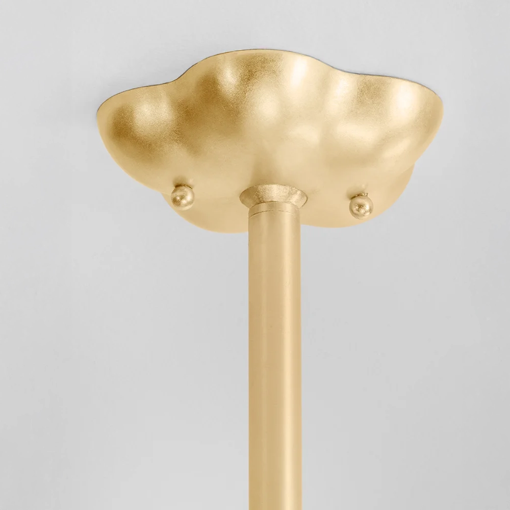 Rimini pairs an organic shape with modern materials. A White Gesso shade with a botanical form suspends from a similarly shaped canopy. The tapered light source above the shade emits a warm uplight. Thoughtfully placed Gold Leaf finishes at the finial, arm and canopy pop against the White Gesso and stand out on a white ceiling.