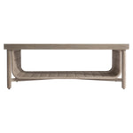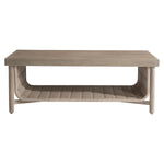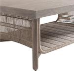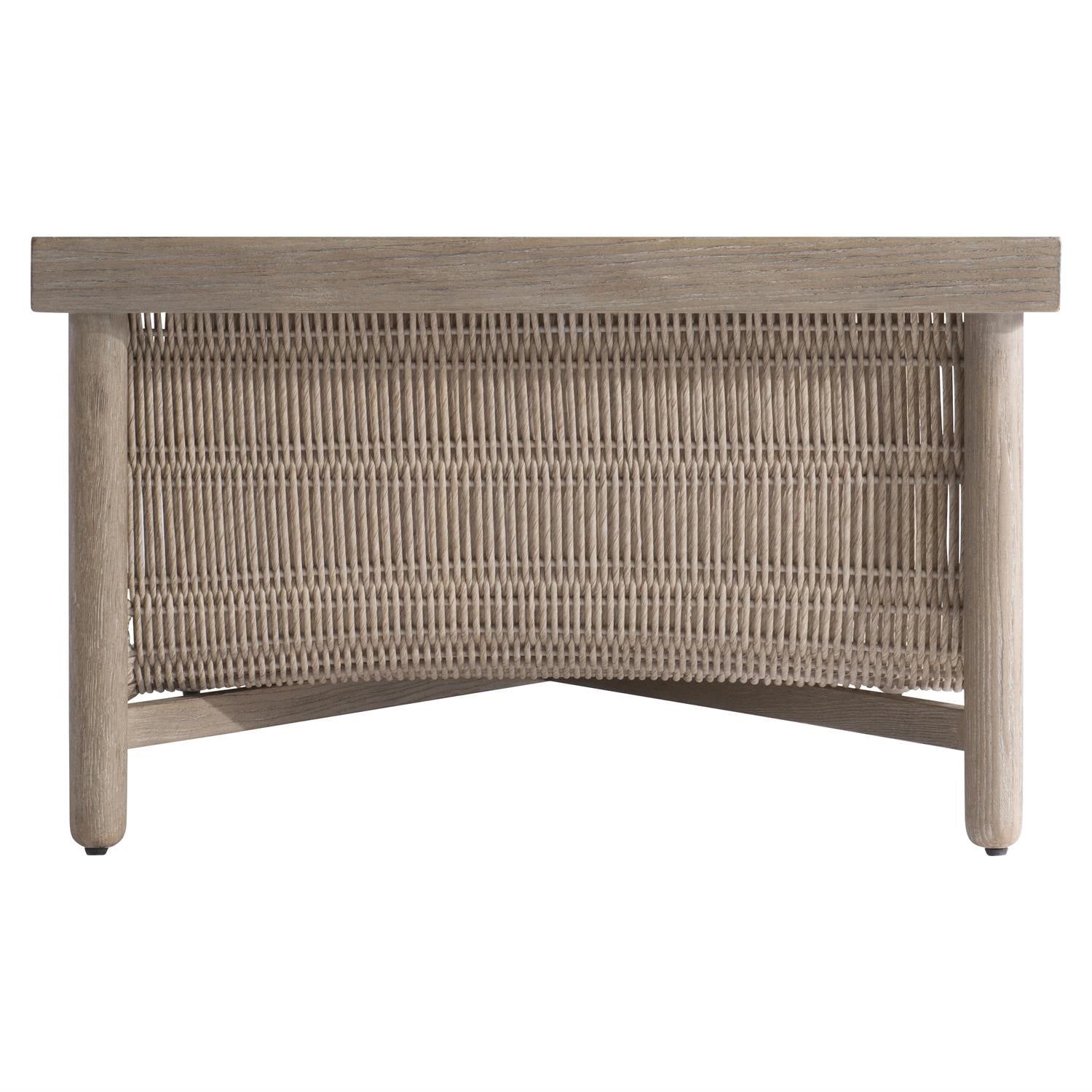 A unique woven shelf creates visual and textural interest in the cocktail table.