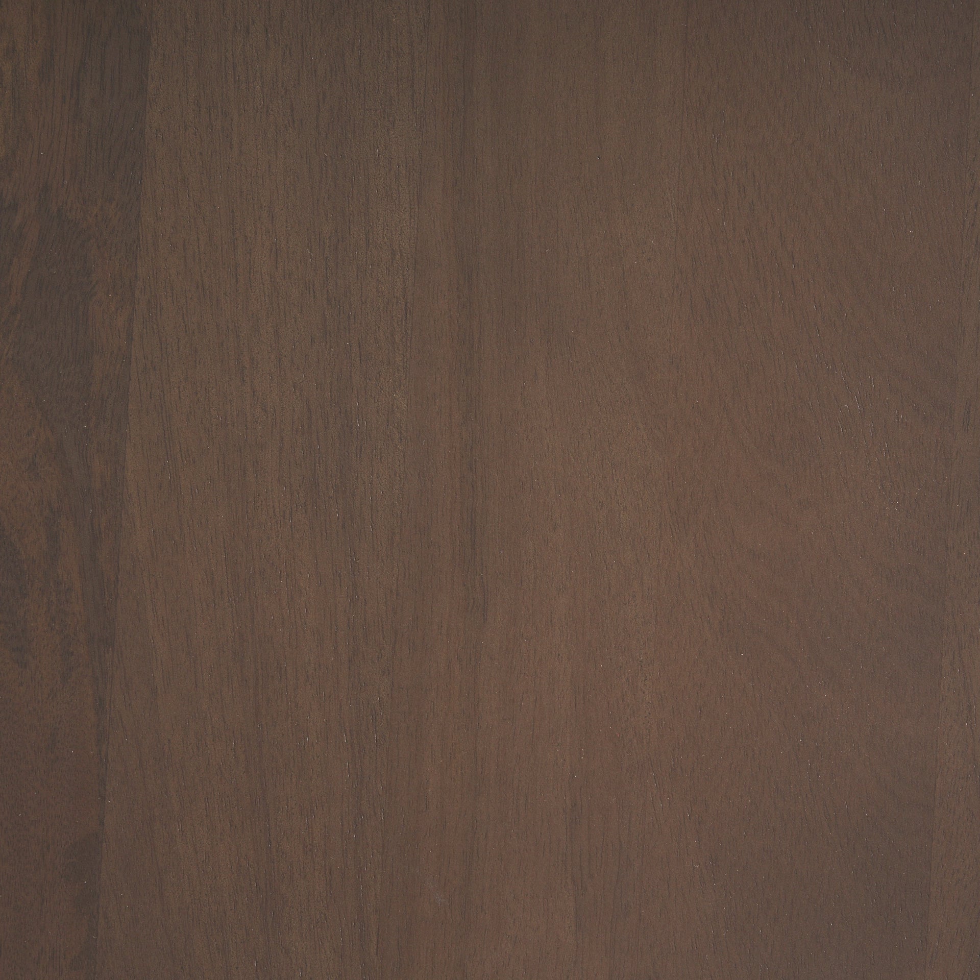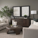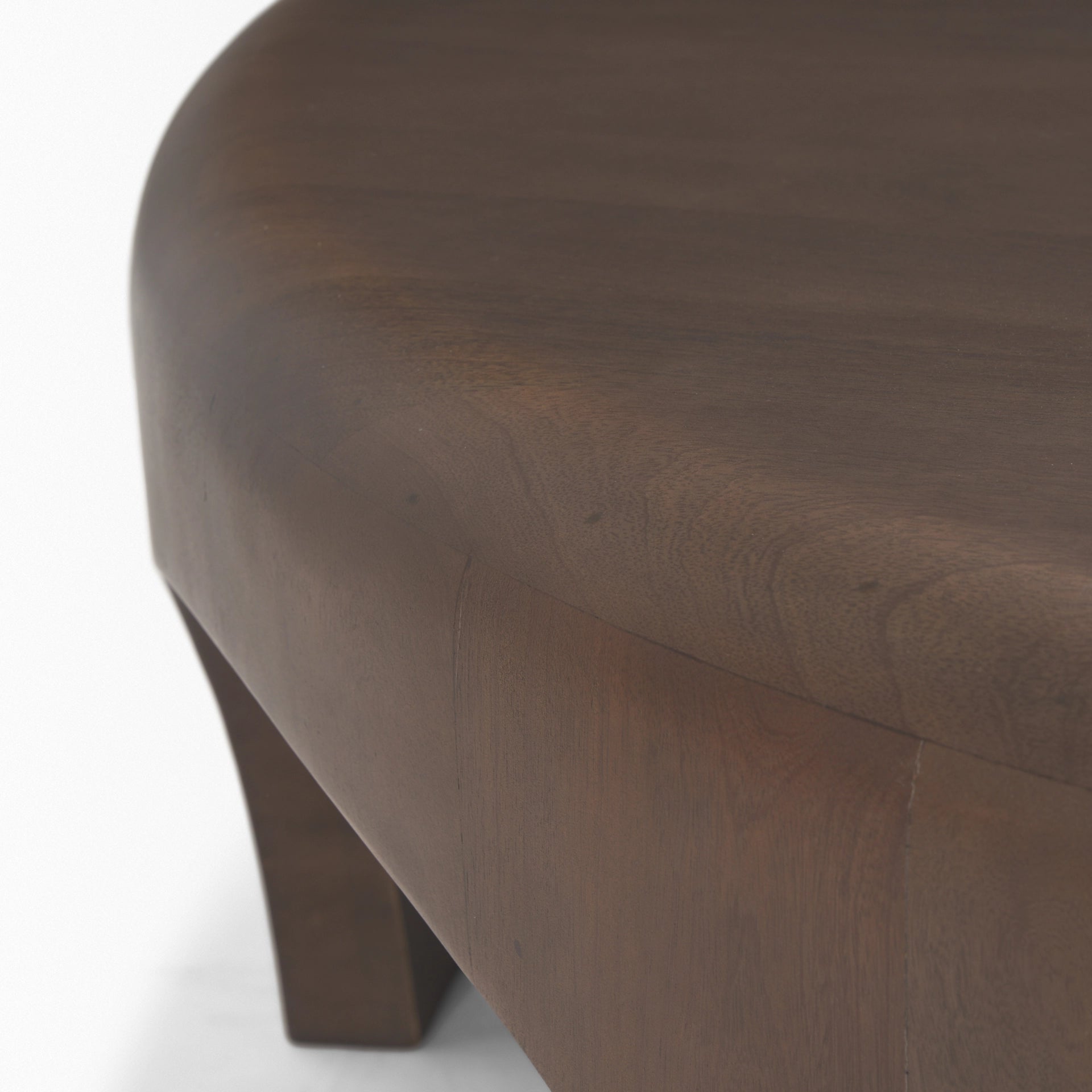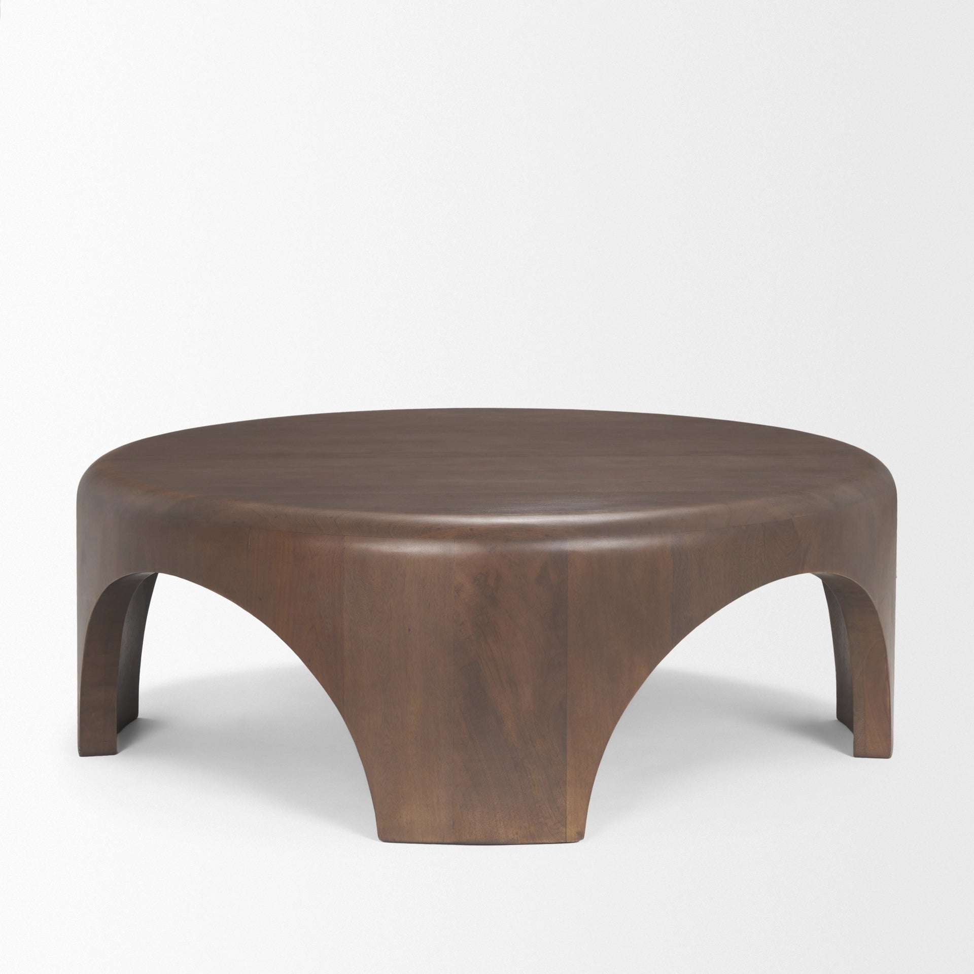 The Shima Coffee Table is a smooth, dark matte brown round coffee table with curved edges and arched cut out legs.
