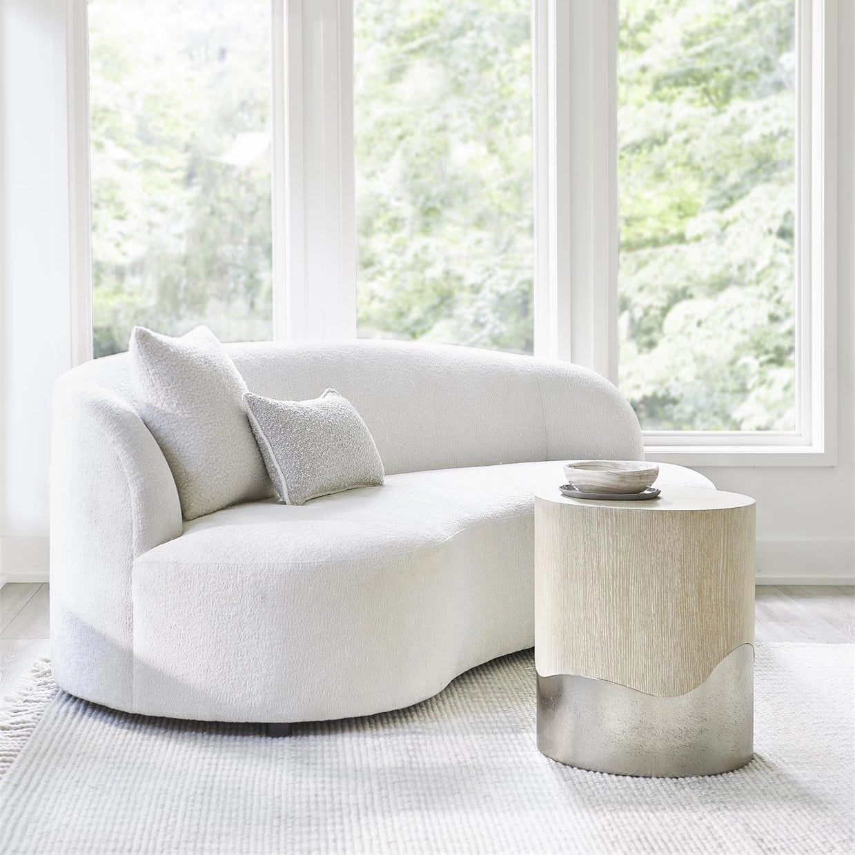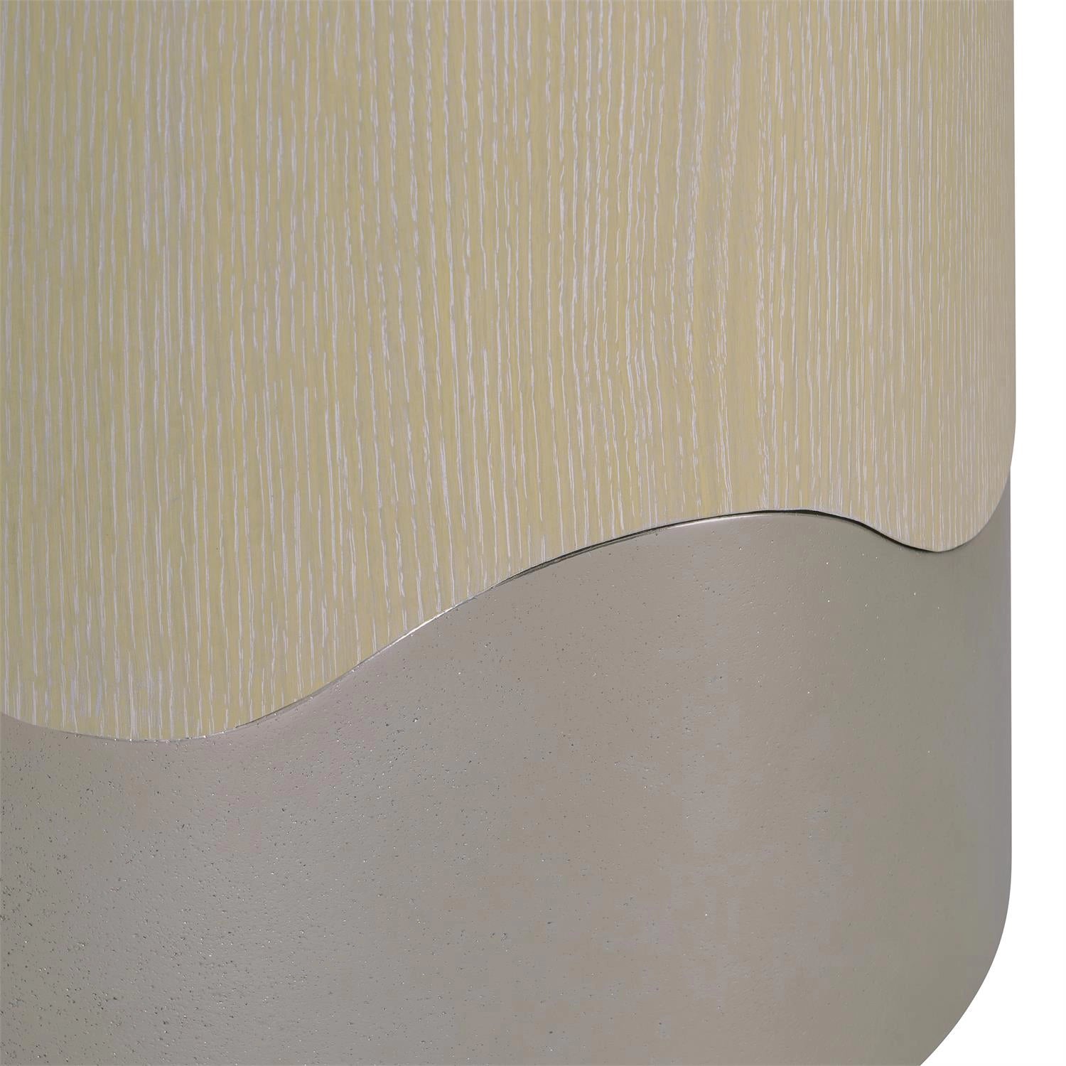 There is beauty in simplicity, as defined by the cylinder shape of this accent table with a wave of metal encircling a wood form.