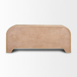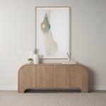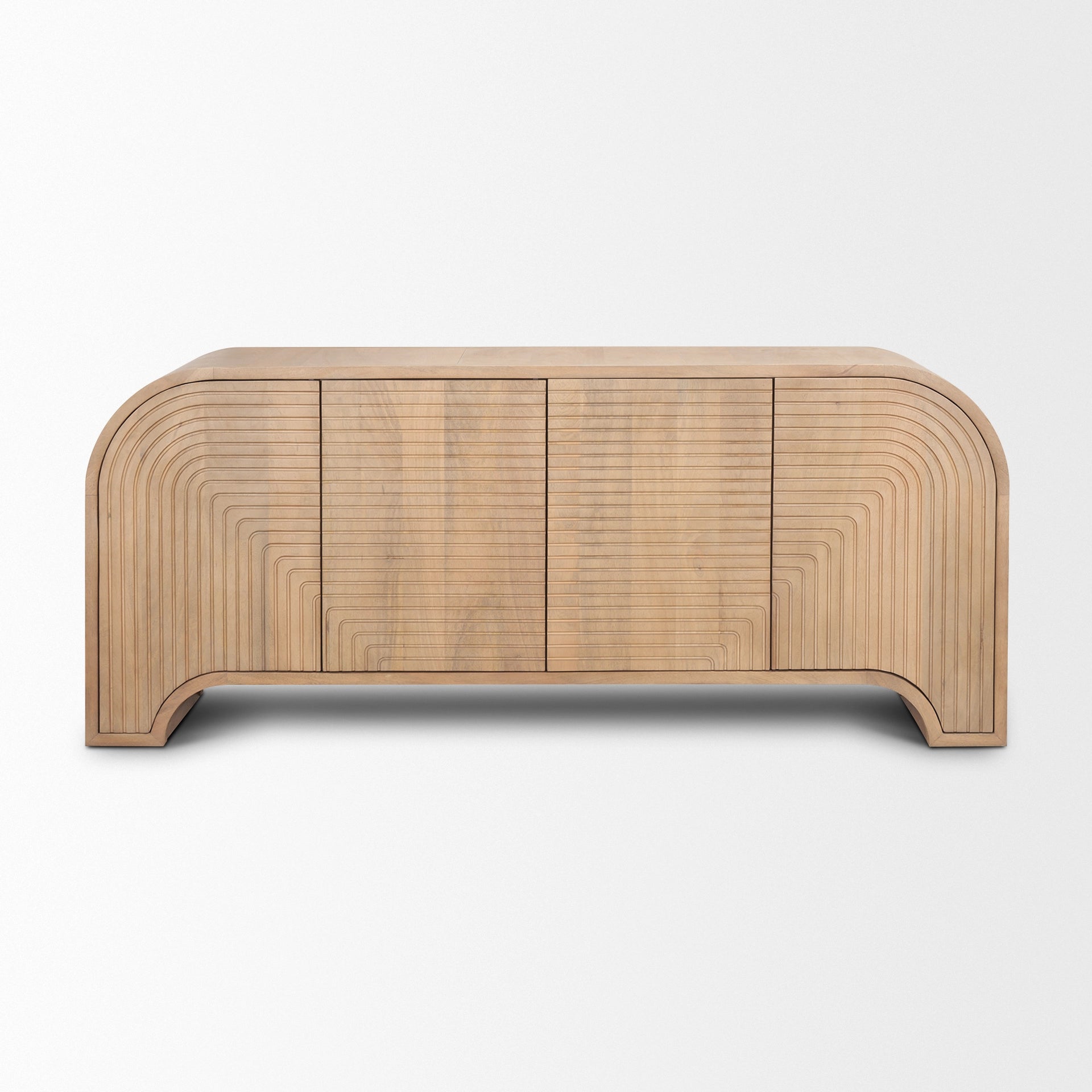 The Sorina Sideboard is crafted from solid mango wood in a natural light brown finish with four reverse fluted CNC cabinet doors.